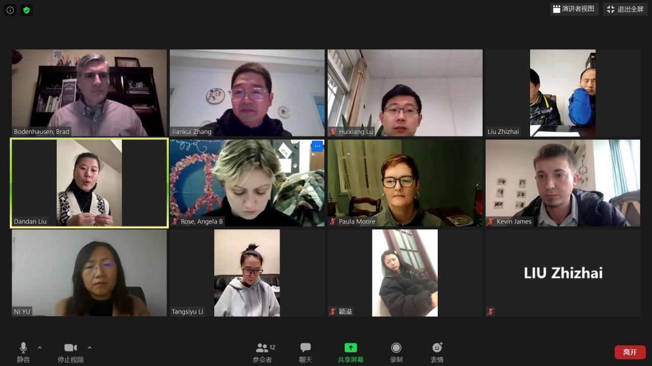 在学院与美国密苏里州立大学(MSU)双方的共同努力下,植物科学与技术专业的英语课程教学稳步有序推进。为及时反馈教学效果,确保教学质量,合作双方于北京时间2月2日上午9:00召开了线上教学研讨会,MSU助理副校长Brad Bodenhausen、英语教师Paula Moore、Kevin James、Angela Rose及学院中外合作办学相关教师参加,会议由MSU国际领导力培训中心主任Dandan Liu和学院中外合作办学办公室主任刘志斋主持。