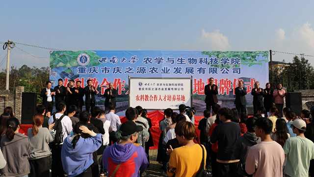 11月8日,学院与重庆市庆之源农业发展有限公司“农科教合作人才培养基地”揭牌仪式在垫江县周嘉镇举行。该基地的建立是为认真贯彻落实习近平总书记给全国涉农高校书记校长、专家代表的回信和新农科建设“三部曲”会议精神,聚焦全面提高农科人才培养能力这个核心点,响应《成人文学