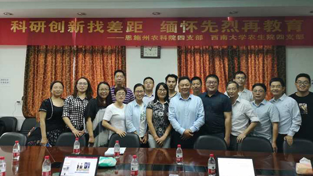 为继承和发扬党的光荣传统和优良作风,进一步深入开展革命传统教育和爱国主义教育,增强支部凝聚力和战斗力,引导党员干部增强党性观念,激发工作热情,发挥党员先锋模范作用。并以此为契机,把科研工作与支部建设相结合,实现党建工作和业务工作两手抓的良好态势,恩施州农科院第四支部一行15名党员到我院与教工第四支部进行深层交流和合作,特此开展科研创新找差距  缅怀先烈再教育的特色活动。活动分座谈会和参观试验基地两部分进行。