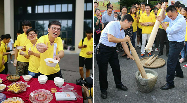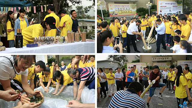 农学与生物技术学院师生一早就备齐了农作物、扁担、木棍等等游戏道具。颗粒归仓摸泥鳅拔扁担猜谜语打糍粑。碓窩、擂簸、扁担在60708090、乃至00后的手中交换着,水稻、红薯、油菜、玉米、烟草、荞麦、土豆统走出实验室、实验田,今天在大家眼里,它们不再是实验数据,而是快乐的源泉。这些早已渗透在农民生活和辛苦劳作中的农事,却在今天,变成了师生们欢声笑语所在,承载了大家满满的乡愁和丰收的喜悦。
