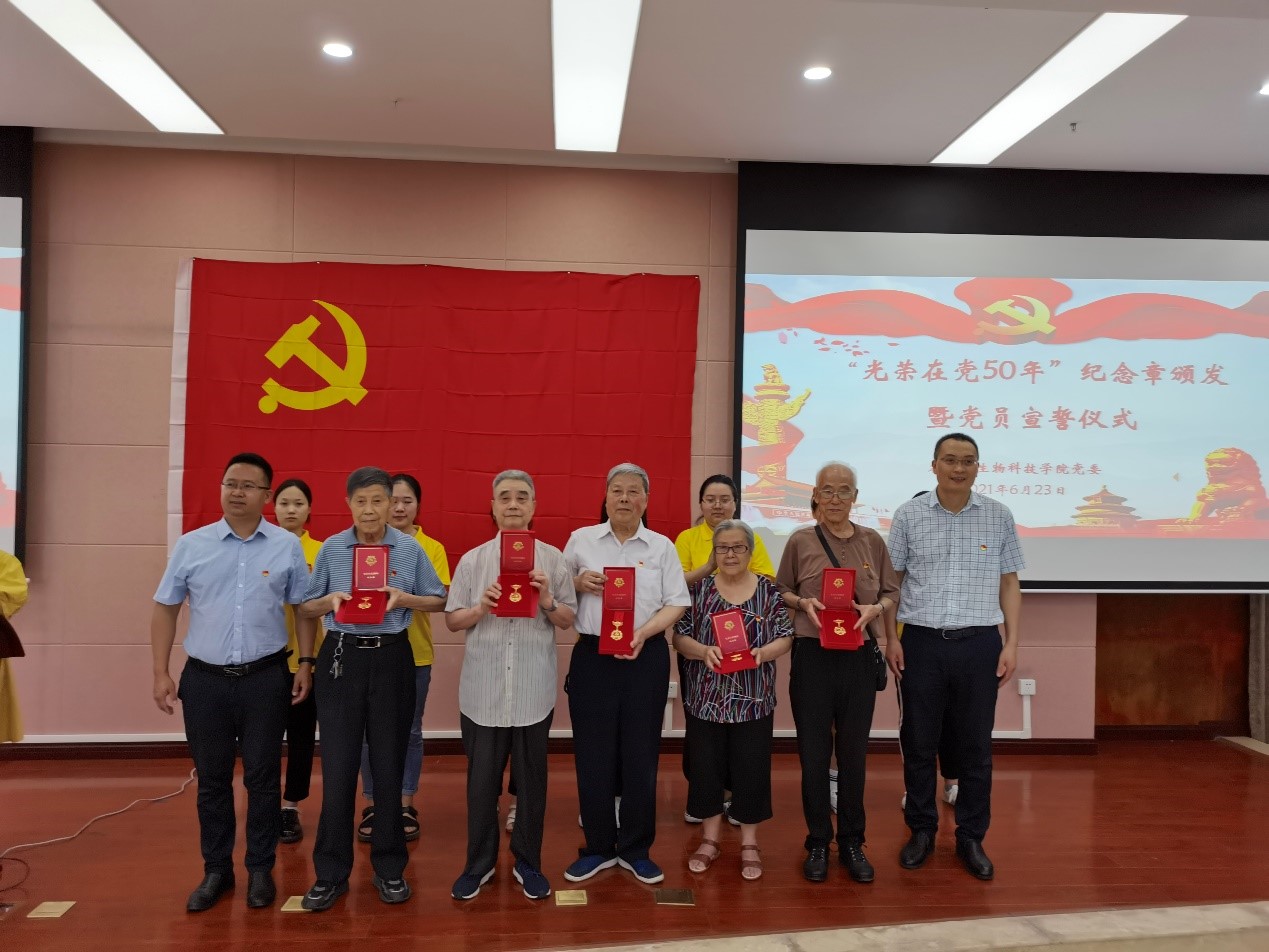 党委“光荣在党50年”纪念章颁发暨党员宣誓仪式在隆平楼204会议室举行。获颁纪念章的老党员代表、学院党委书记阳义健、党委委员院长吕典秋、党委委员副书记郑莉佳、党委委员副院长卢坤、党委委员柴友荣同志、各学生支部书记、全体在校学生党员参加了仪式,仪式由郑莉佳副书记主持。