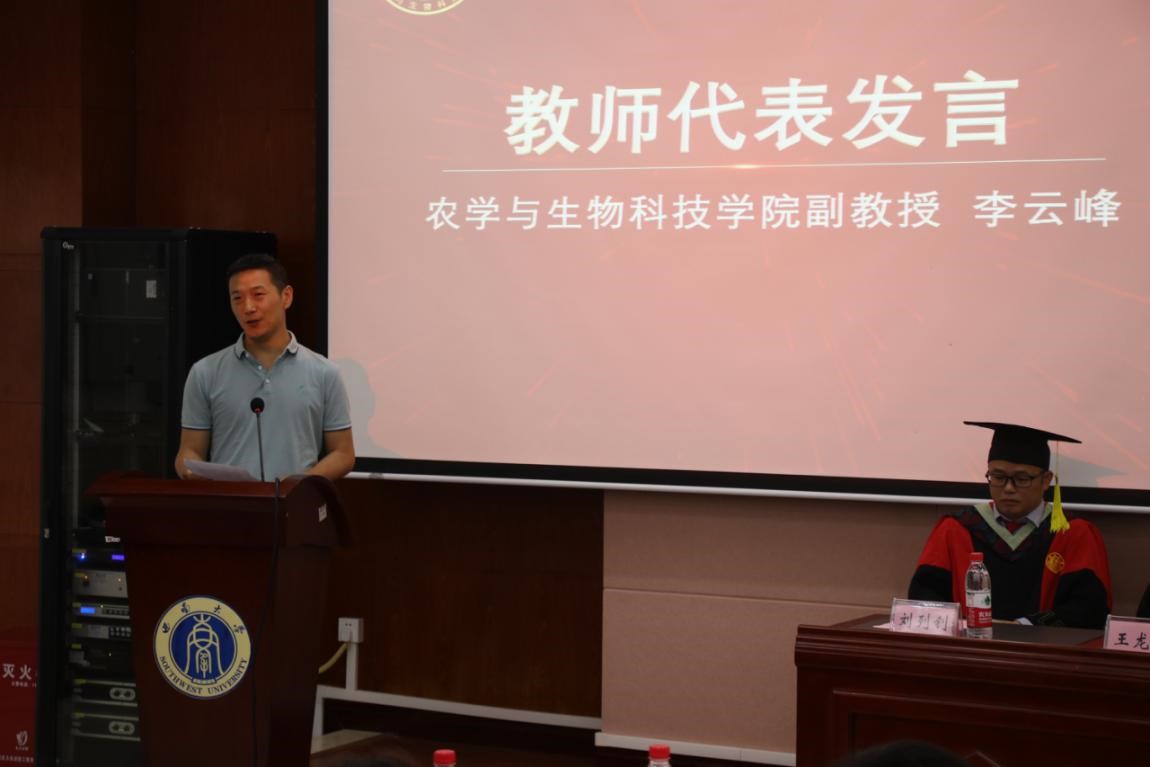 教师代表李云峰老师发言,希望大家能铭记“追梦求实”的院训,仰望星空,脚踏实地,向袁隆平院士学习,做一个心怀梦想的新农人,勇敢地追梦前行。他建议毕业生要做好人生规划的同时,要保持良好的品行修养,做到价值观正、人生观正、人品更正。