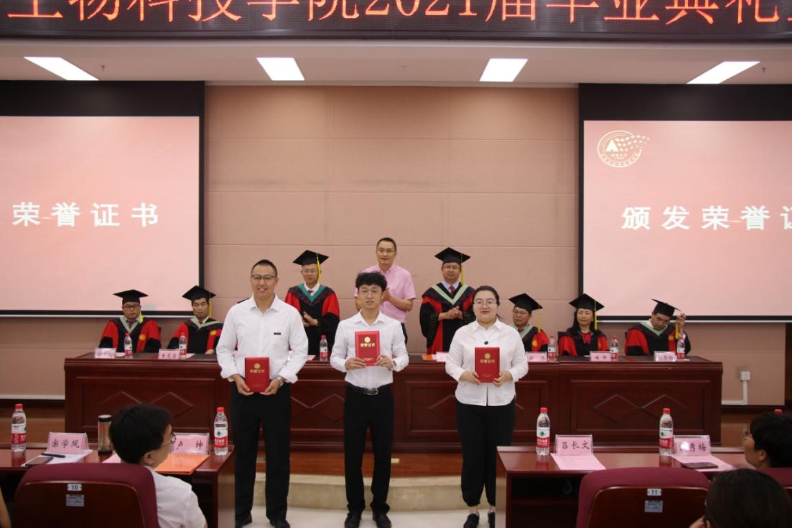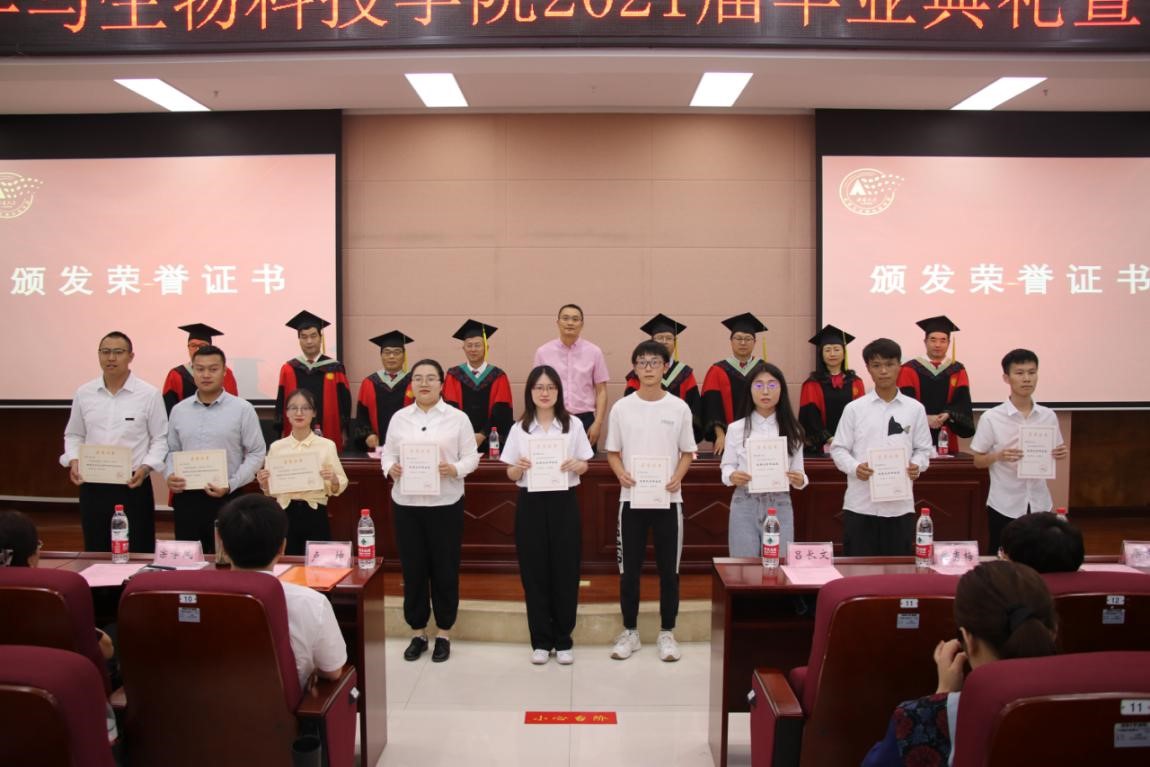 关于表彰2021年优秀毕业生和优秀毕业研究生的决定》,台上领导和嘉宾为优秀毕业生代表颁发荣誉证书,一张张鲜红的证书见证了他们精彩而又难忘的大学生活,激励他们继续砥砺前行。