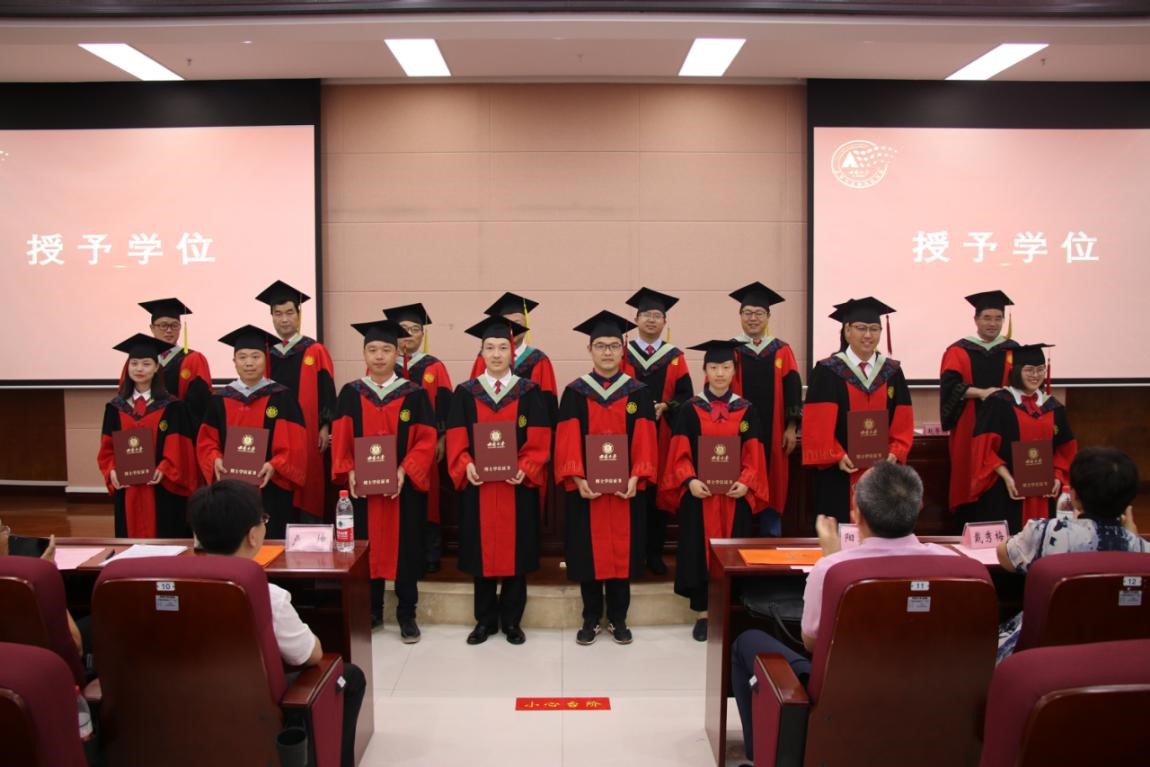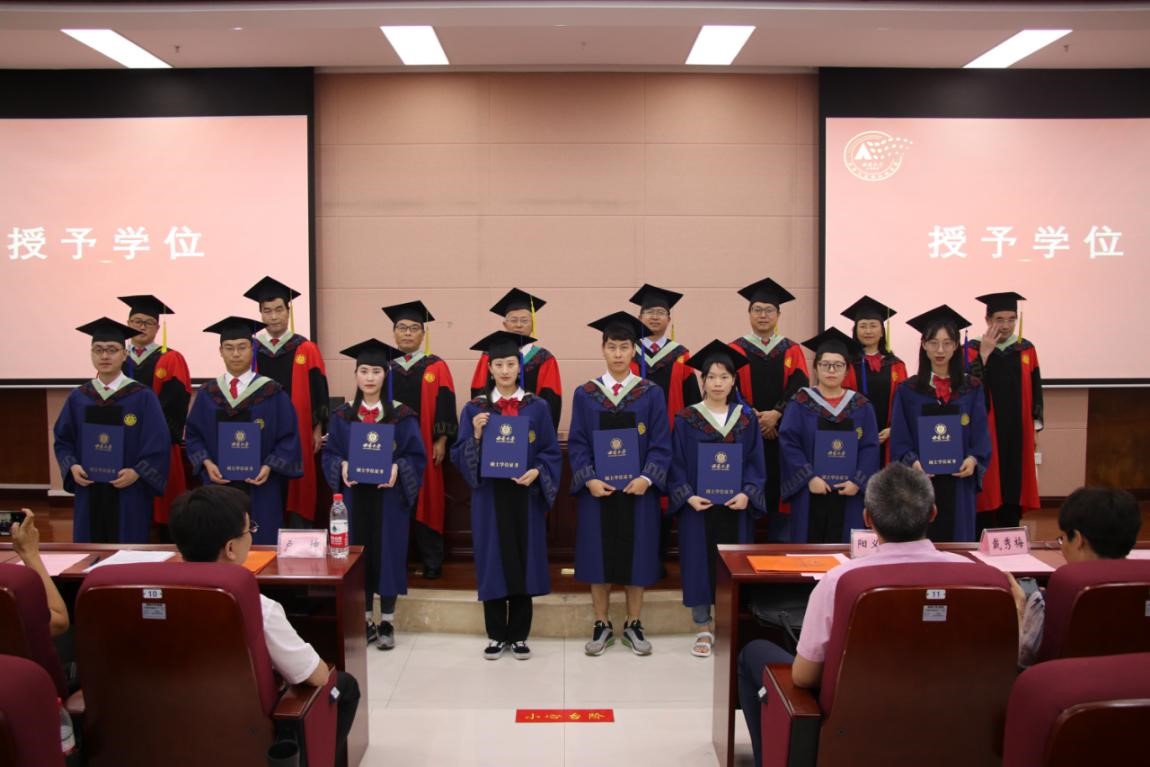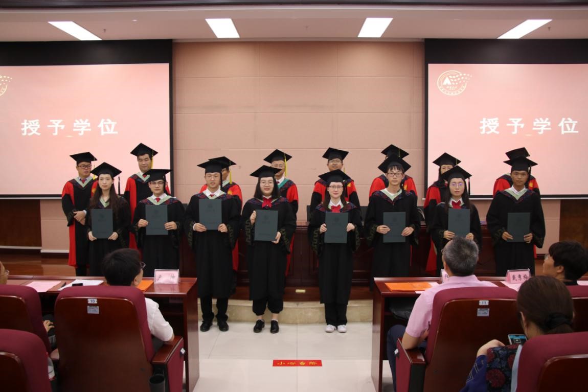 在学位授予环节,学院学术委员会主任吕典秋教授宣读了学位授予决定,全体学术委员会委员为毕业生授位并颁发学位证书。