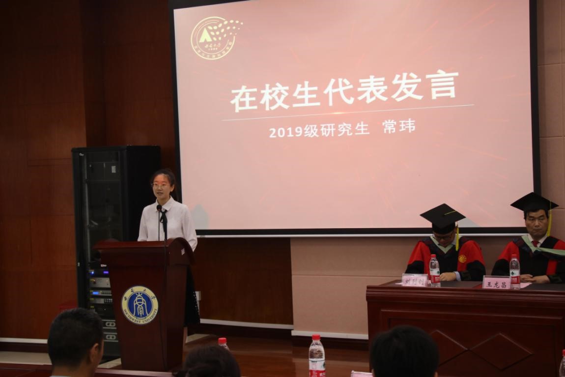 2019级遗传学专业硕士研究生常玮同学作为在校生代表发言,她向所有毕业生送上衷心的祝福,祝愿大家前程似锦。希望同学们用奋斗点燃青春之火,以蓬勃朝气,昂扬锐气,为民族复兴和国家富强贡献力量,在矢志奋斗中闪耀青春之光。