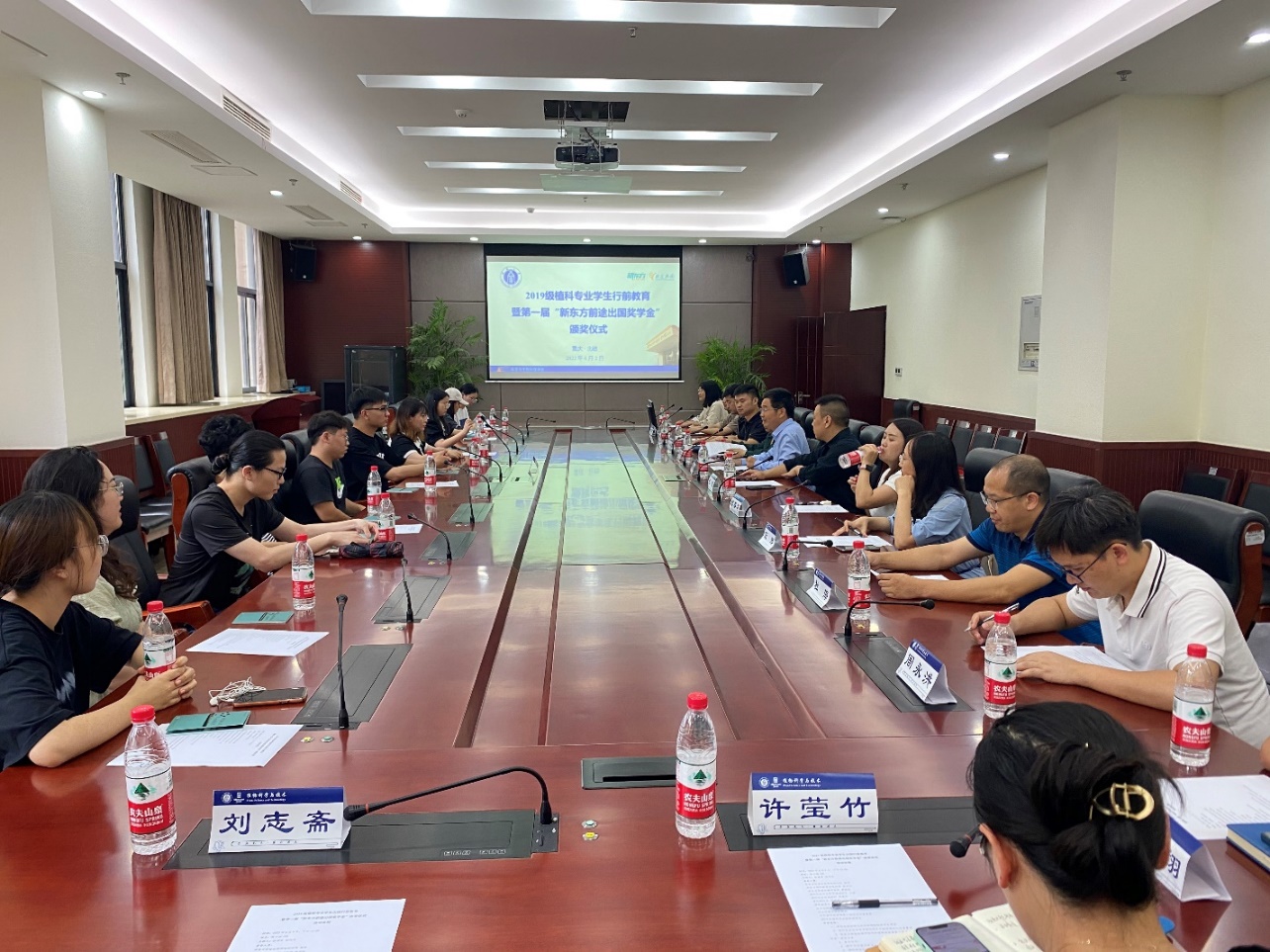 在隆平楼108会议室召开学生行前教育暨第一届“新东方前途出国奖学金”颁奖仪式。新东方前途出国公司代表、国际合作与交流处领导、学院领导及相关工作人院和2019级11名转校区学生参加会议。会议由张建奎副院长主持。