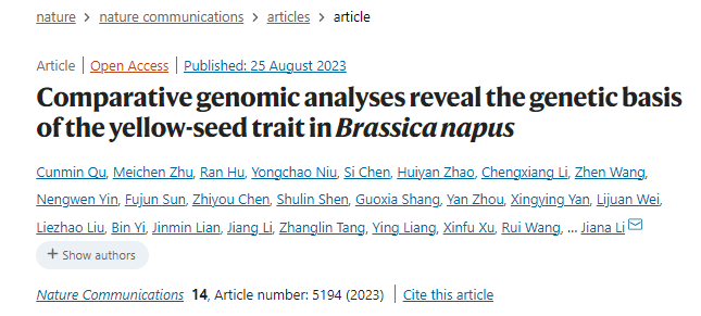 油菜分子生物学研究团队李加纳教授/曲存民教授在Nature Communications发表了题为Comparative genomic analyses reveal the genetic basis of the yellow-seed trait in Brassica napus的研究论文,该研究通过甘蓝型油菜黄籽GH06和黑籽中油821高质量基因组的组装,围绕控制种皮色泽主效QTL区间,成功克隆了一个控制油菜种皮色泽重要基因,并解析了其参与调控种皮色泽形成和类黄酮代谢的分子机制,为油菜品质性状改良提供了新的分子策略。