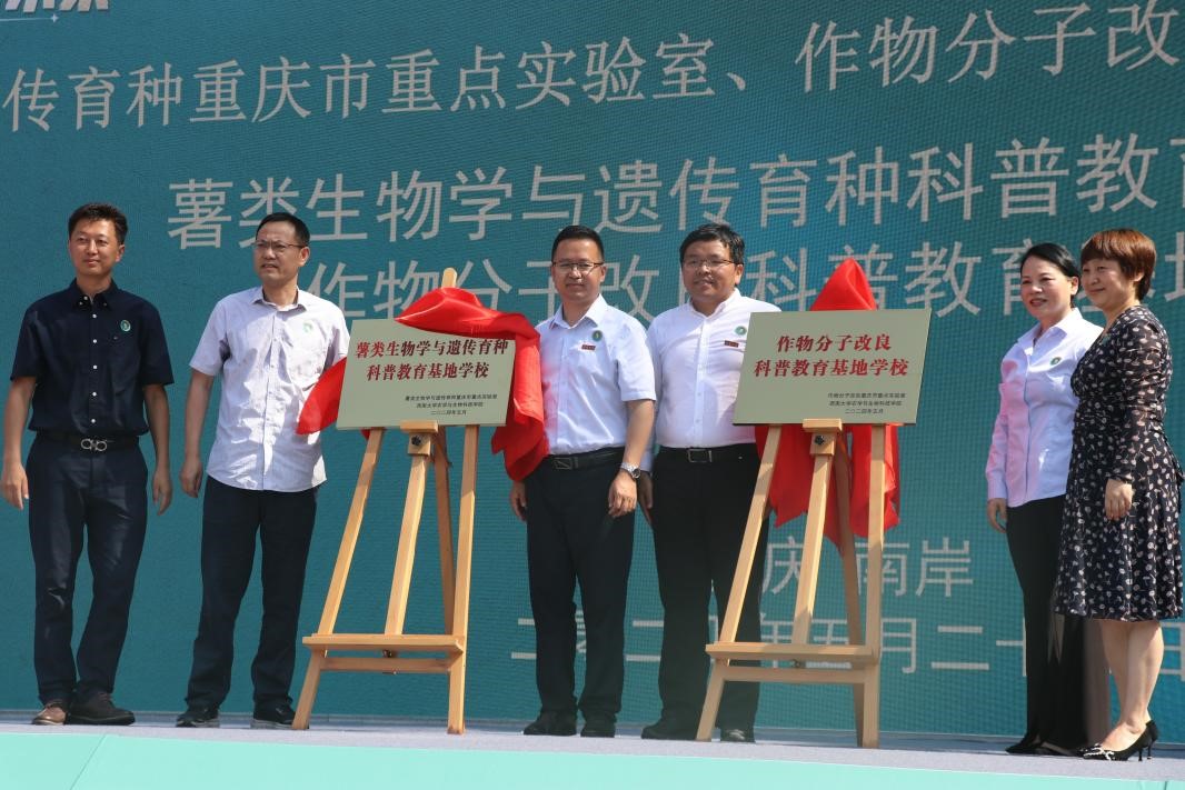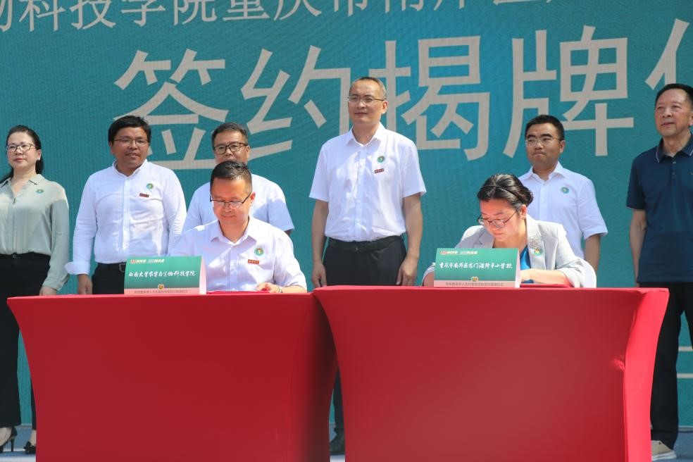 在与会人员共同见证下,西南大学农学与生物科技学院院长吕典秋与重庆市南岸区龙门浩隆平小学校校长董宏燕代表双方单位签订合作协议。西南大学农学与生物科技学院党委书记阳义健、院长吕典秋、副院长曲存民分别为“智慧农业驻点指导基地学校”“大学生社会实践基地学校”“薯类生物学与遗传育种科普教育基地学校”和“作物分子改良科普教育基地学校”揭牌。