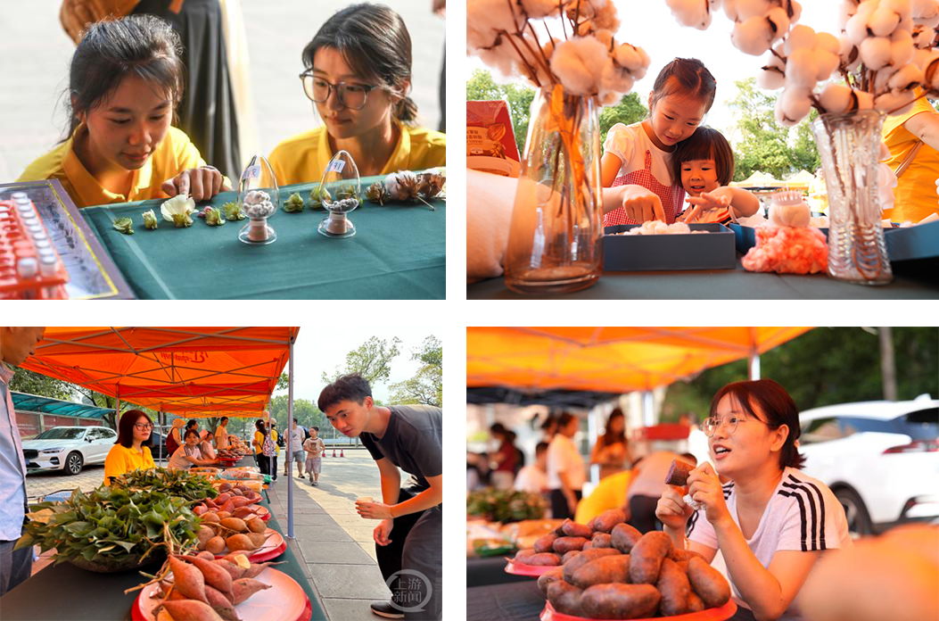 本届丰收节继续设置农业展览区,学院13个不同作物的科研团队纷纷展出各自的优秀科研成果和产品,其中有水稻、玉米机、烟草、油菜、大豆、荞麦等,展现了学院在农业科学研究的丰收成果。“五谷丰登” 展区,有蒸熟的甜南瓜、红薯、爆米花、毛豆、米饭等食品供师生免费品尝;“妙语解颐” 科普区内,各课题组利用大屏幕滚动播放 5 - 8 分钟的微课堂,轮流宣讲贴近生活的农产品知识和先进的农业科技设施。整个活动场地欢声笑语、加油声和喝彩声交织回荡,一片喜气洋洋的景象。