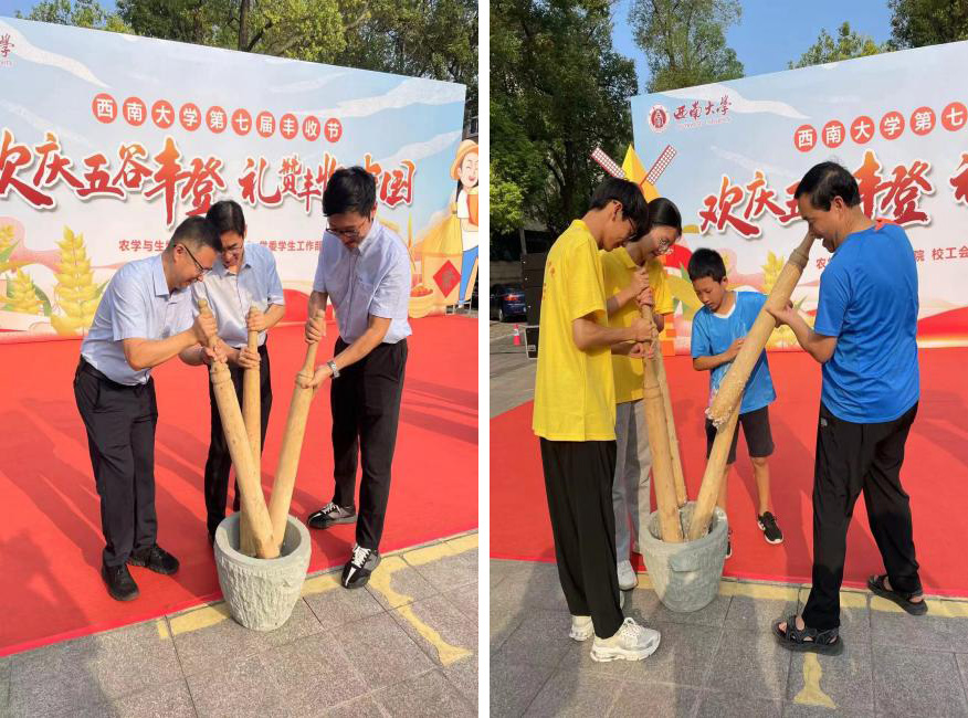 春华秋实,岁月安然,亿万农民怀揣中国梦。为庆祝第七届 中国农民丰收节,9月22日,学院以“欢庆五谷丰登,礼赞丰收中国”为主题,成功举办西南大学第七届中国农民丰收节系列活动。全校师生一道参与农事民俗体验、农事竞赛活动,参观科研农产品展览,共享丰收的喜悦,体验劳动的快乐。学校研工部部长秦松、团委书记于涛、工会副主席李玉兰、教学质量监控与评估中心主任陶丽以及学院领导班子、师生代表等出席活动。
