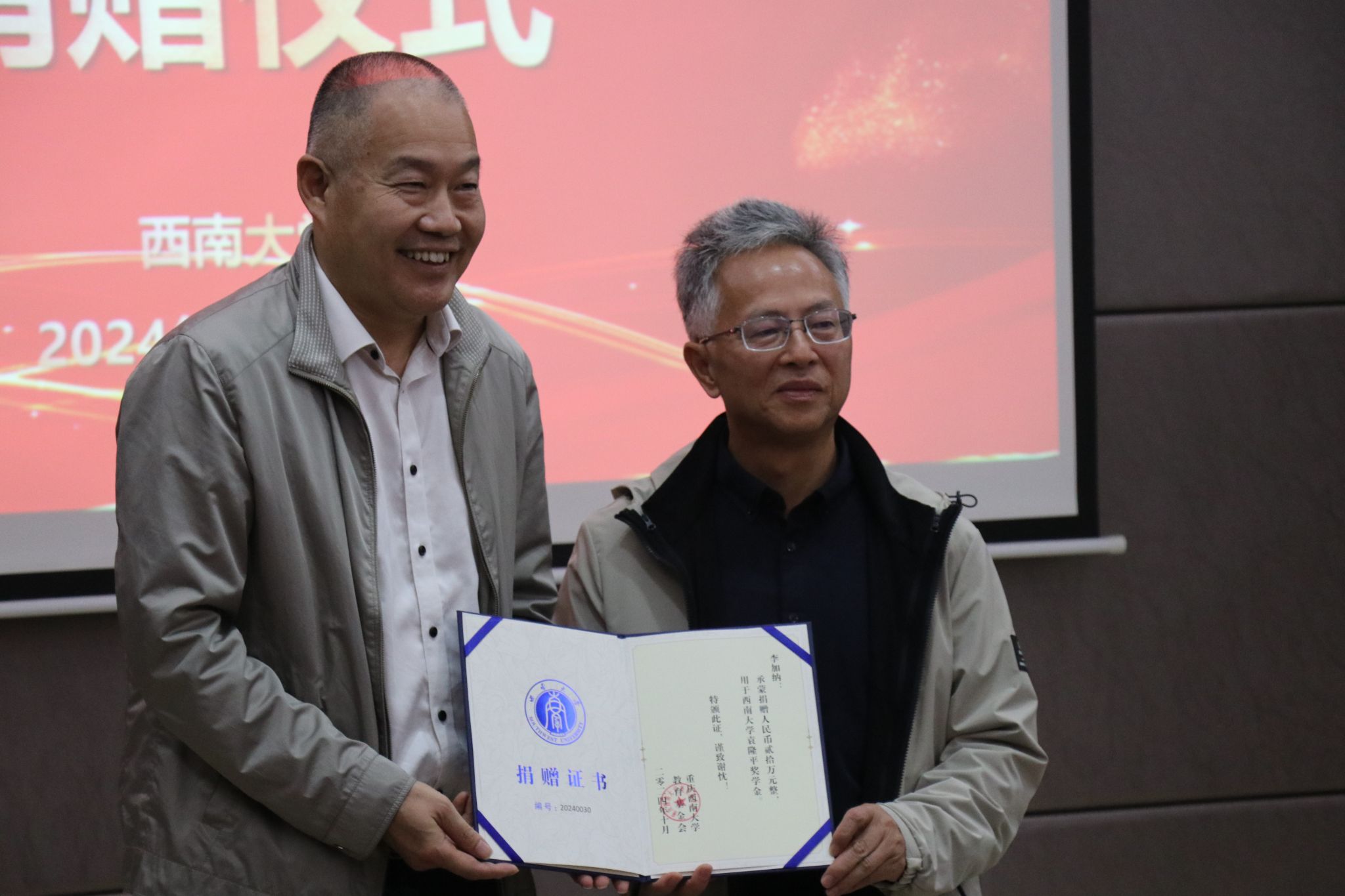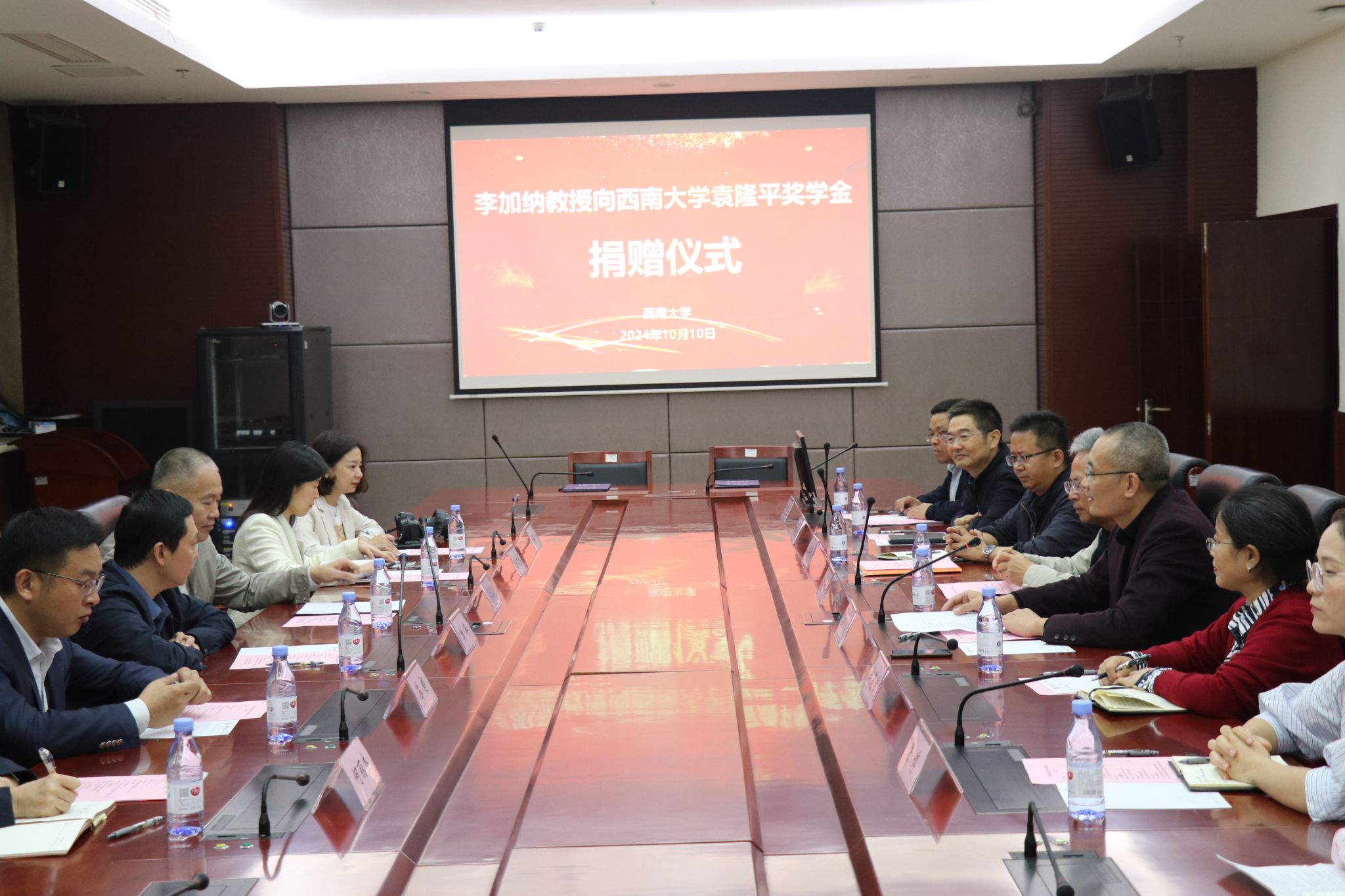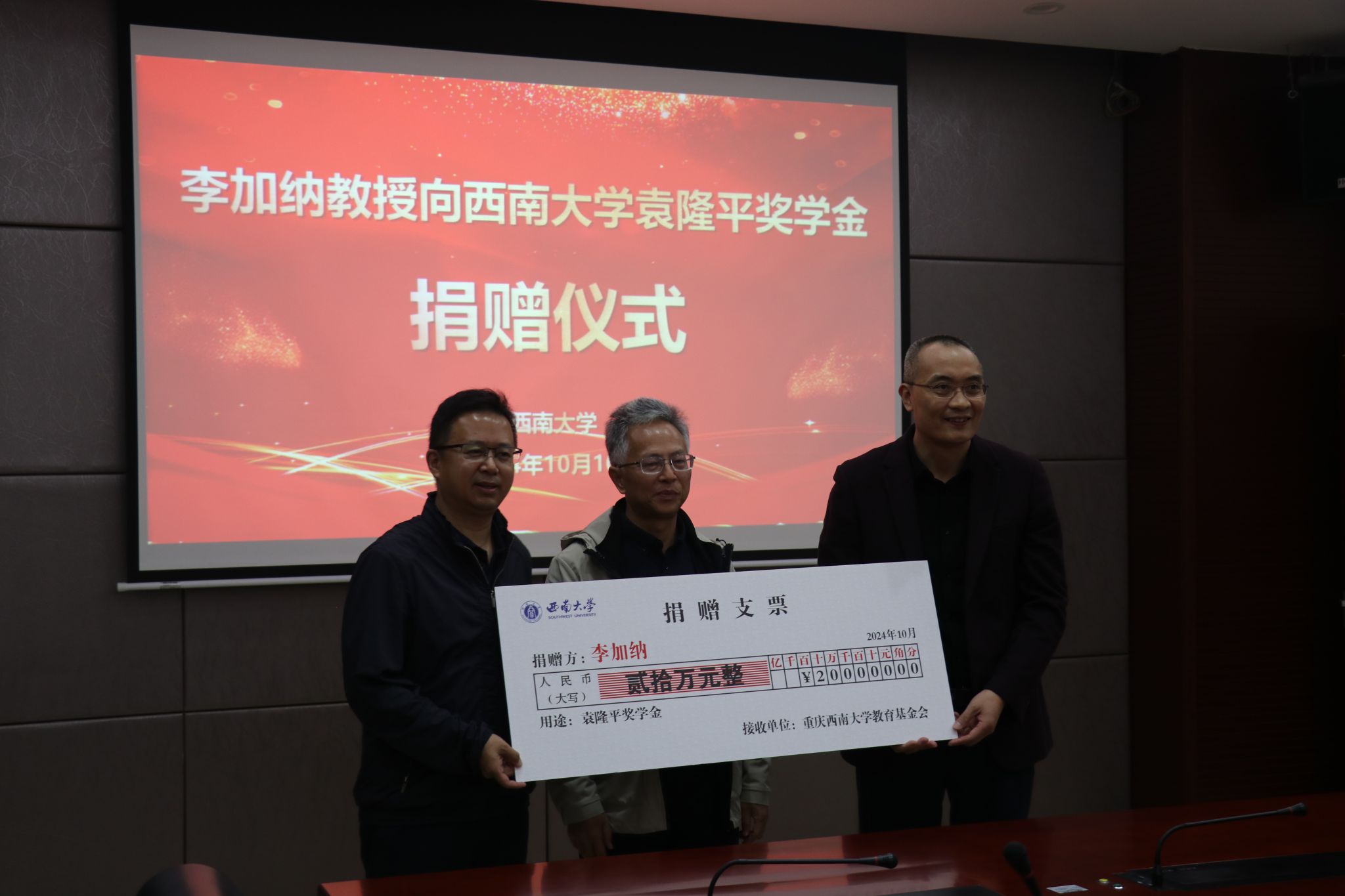 10月10日上午,李加纳教授向西南大学袁隆平奖学金捐赠仪式在隆平楼108多功能厅顺利举行。校党委常委、副校长葛信勇,对外联络办公室唐军主任、陈建英副主任, 学院李加纳教授、领导班子全体成员和师生代表等参加了捐赠仪式。仪式由学院党委书记阳义健主持。