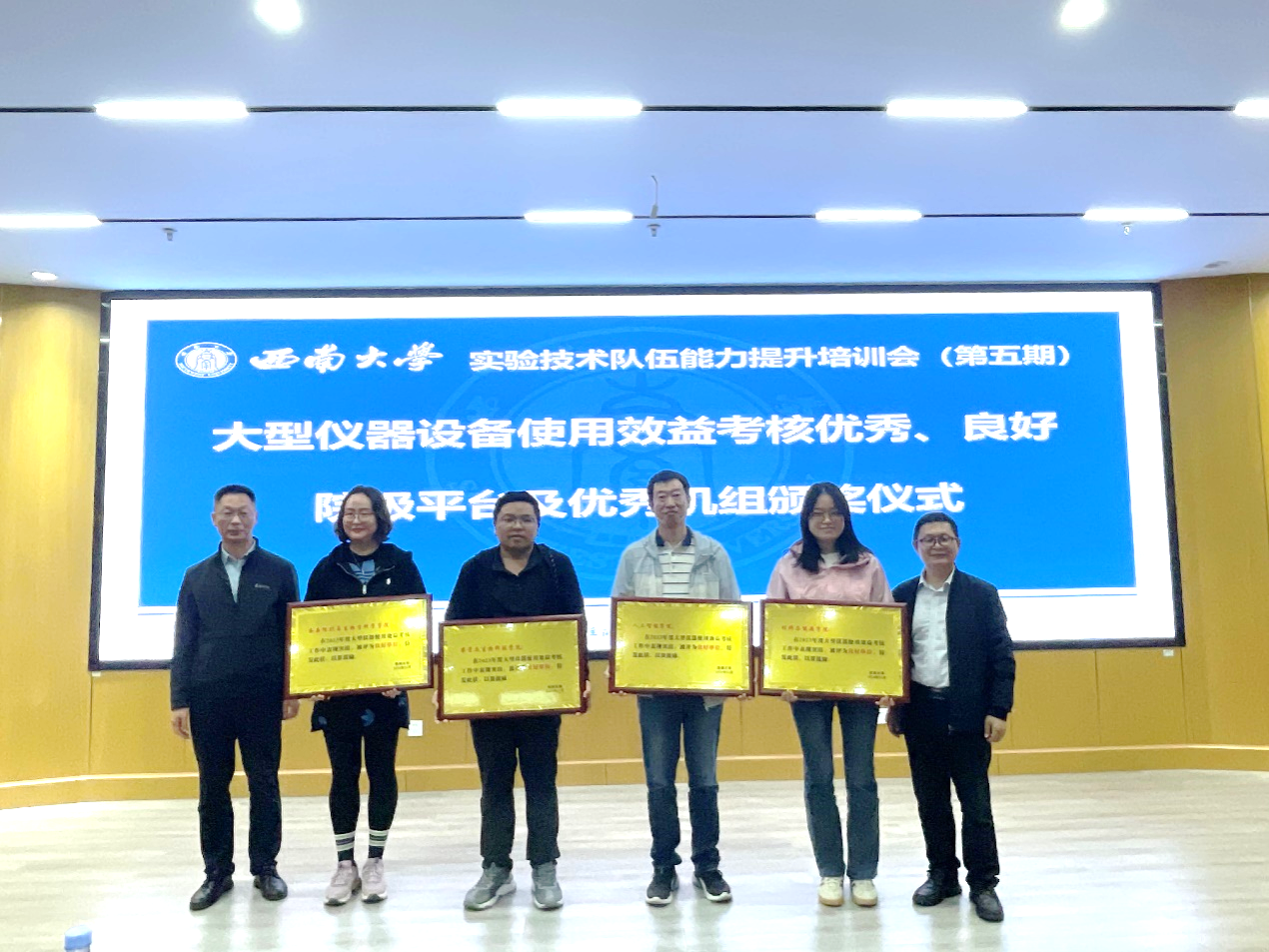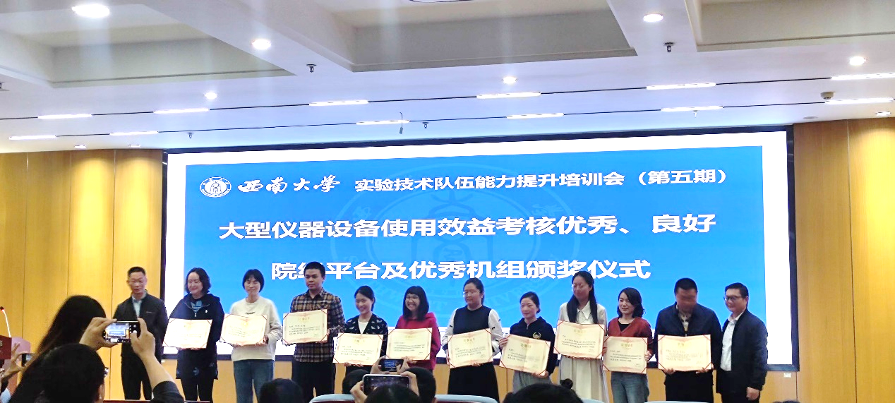 2024年11月6日下午,西南大学实验室建设与设备管理处组织召开了第五期西南大学实验技术队伍能力提升培训会,内容包括实验室数智化建设与安全管理和2023年度大型仪器优秀平台颁奖典礼。学院曲存民副院长率科研共享平台和本科实验中心等大型共享仪器机组负责老师参加了此次会议。