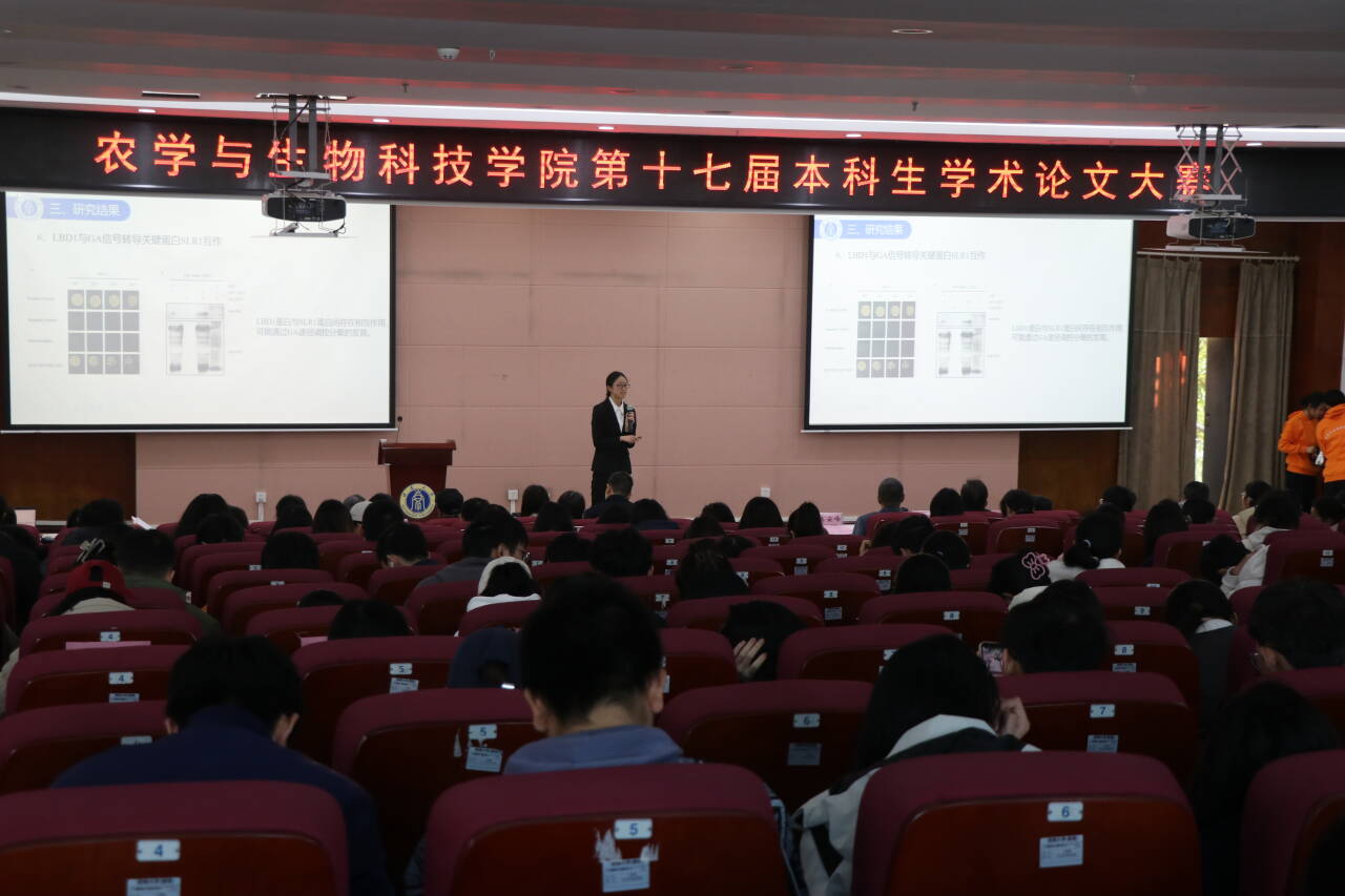 展演答辩环节由张建奎副院长主持,张院长向同学们介绍答辩规则与流程后,各选手依次进行陈述和答辩,根据所在团队的研究课题进行论文陈述,从研究背景与意义、技术路线、研究结果、创新点、展望与思考等方面进行汇报。 展演作品包括《水稻PGS1基因调控内稃及籽粒发育的分子机制研究》 《LBD1介导GA和SL调控水稻分蘖发育的分子机制》《甘蓝型油菜 BnMYB93-1转录因子调控侧根密度的分子机制研究》《StHSP101增强马铃薯抗旱性的功能和机制解析》 《BBA_05630基因对球孢白僵菌卵孢素合成、抗逆及致病性的影响》 《国家重点生态功能区三产融合的时空演变特征及生态韧性效应研究》《技术扩散模式对农户作物新品种采纳行为的影响研究》等多角度、多方向、多层次的研究课题,充分体现农生学子开放发散的思维和广阔的研究视野。在答辩环节中,现场的各位评委老师就论文作品的研究方法运用、实验数据相关性、调查的样本量、论文创新点和实用性、研究结论以及大规模生产成本等方面进行提问,并指出选手论文的不足和疏漏之处,对选手们图表的制作和PPT讲述提出改进建议,对项目未来的研究方向提出指导性意见。现场的选手答辩、精彩问答,让在场同学们受益匪浅,收获颇多。