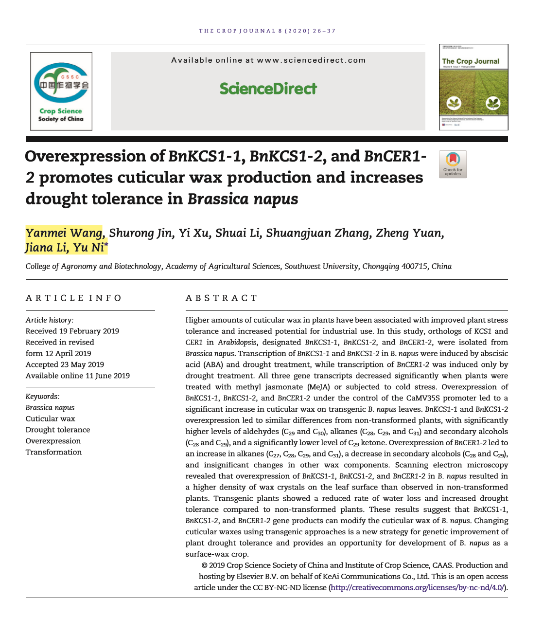 4、硕士生王艳玫以第一作者身份在农林领域权威期刊The Crop Journal (2018 Impact Factor为3.179)上发表研究论文《Overexpression of BnKCS1-1,BnKCS1-2, and BnCER12 promotes cuticular wax production and increases drought tolerance in Brassica napus》。研究发现过表达BnKCS1-1、BnKCS1-2和BnCER1-2导致转基因油菜叶片表面蜡晶密度高于对照,转基因植株失水率降低,耐旱性增强。结果为油菜作为一种表面蜡质作物的开发提供了契机。倪郁教授为论文通讯作者,西南大学为唯一完成单位。研究受到国家自然科学基金,重庆市基础与前沿研究计划项目,中央高校基本科研业务费项目资助。