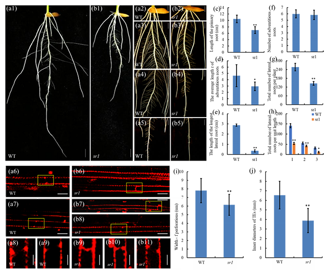 该研究通过图位克隆和遗传互补获得了短根突变基因SR1,其编码具有EXO70结构域的植物保守蛋白EXO70L2,仅在根分生组织和导管中表达。SR1突变使根部分生组织细胞增殖受损、细胞减少,导致根变短;同时相邻导管间穿孔受到影响,木质部发育异常。最终致使植株矮化、叶片水势和水分含量降低,叶片枯死(图1)。SR1的研究丰富了胞泌复合体参与水稻根发育的功能解析。