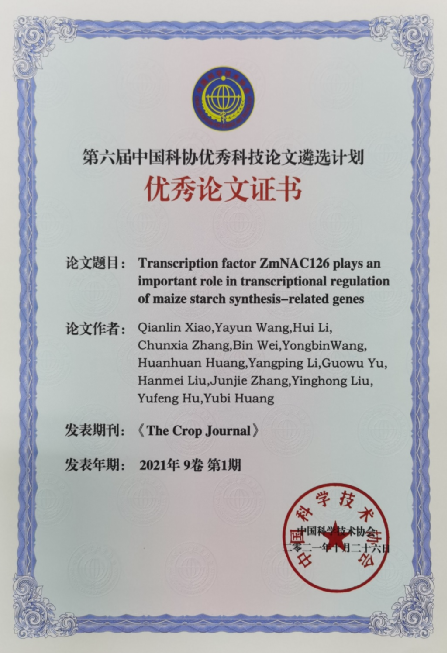 根据《第六届中国科协优秀科技论文遴选计划实施方案》,经过各学科领域专家推荐、初评遴选、终评审定并向社会公示,最终确定95篇论文获评2021年度优秀科技论文。我院肖前林博士发表于Crop Journal(2021, 9: 192-203)的一篇题名为“Transcription factor ZmNAC126 plays an important role in transcriptional regulation of maize starch synthesis-related genes”的论文,成功获评中国科协优秀科技论文遴选计划农林集群“特等奖”,暨第六届中国科协优秀科技论文。