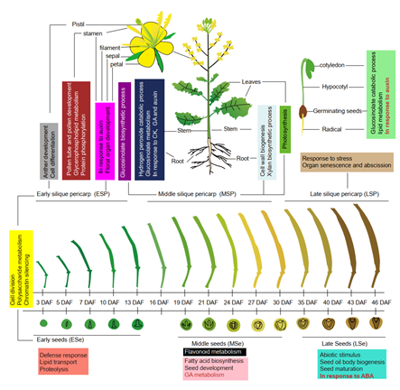 该团队对甘蓝型油菜6个发育时期的24个组织器官进行了转录组分析,发现这些组织器官可以分为8类。甘蓝型油菜角果皮与根、茎、叶的功能部分相似。硫苷代谢过程在甘蓝型油菜根和角果皮发育过程中起着重要作用,蛋白磷酸化过程在花药和种子发育早期过程中起着重要作用。研究还鉴定到17,100个在不同组织器官中特异表达的基因,包括889个转录因子,发现转录因子的组织特异性强于结构基因。在基因共表达网络中,部分倾向表达基因被鉴定为hub基因,发现其可能通过多种激素信号通路实现对油菜不同组织器官发育的特异调节。另外,团队比较了甘蓝型油菜AC亚基因组同源基因的表达模式,发现甘蓝型油菜中不存在AC亚基因组表达优势。同源基因的时空表达差异与启动子中转座子和调控元件数目相关。本研究提供了完整的甘蓝型油菜转录组图谱,还挖掘了甘蓝型油菜生长和发育的重要基因。