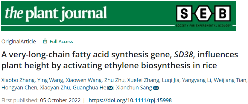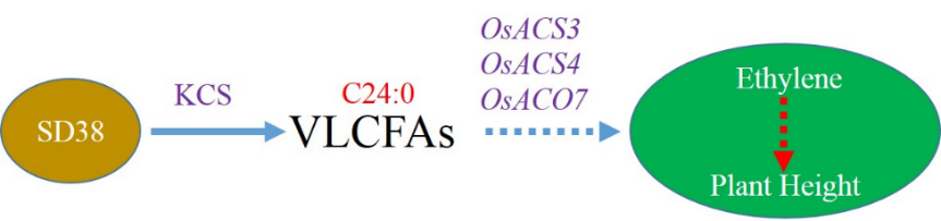近日,西南大学水稻研究所何光华/桑贤春团队在The Plant Journal上发表了题为“A very-long-chain fatty acids synthesis gene, SD38, influences plant height by activating ethylene biosynthesis in rice”的研究论文,解析了VLCFAs通过促进乙烯合成相关基因的表达、进而影响水稻株高的新机制。