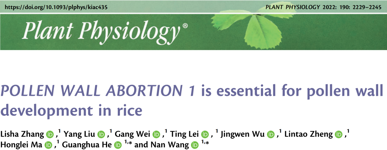 2022年9月16日Plant Physiology (IF2021=8.005) 在线发表了西南大学水稻研究所的题为“POLLEN WALL ABORTION 1 is essential for pollen wall development in rice”的最新研究成果。该研究通过对一个雄性不育突变体pwa1 (pollen wall abortion 1)的研究,发现突变体的花粉内壁缺失,花粉外壁柱状层缺失导致外壁外层和外壁内层融合,最终导致花粉填充失败,完全不育。PWA1编码一个保守的含有CC结构域的表达蛋白,定位于细胞核,在花药的绒毡层和小孢子中均有表达。研究发现,PWA1与花药发育重要转录因子TIP2依赖CC结构域存在互作关系,TIP2直接结合PWA1的启动子调控PWA1的表达,且进一步通过构建双突变体证明了TIP2位于PWA1的上游。研究还发现PWA1具有转录激活活性,并可能通过直接激活花粉内壁形成关键基因Os12BGlu38的表达而参与对花粉内壁的调控(图2)。该研究拓展了水稻花药外壁与花粉壁的发育调控途径。