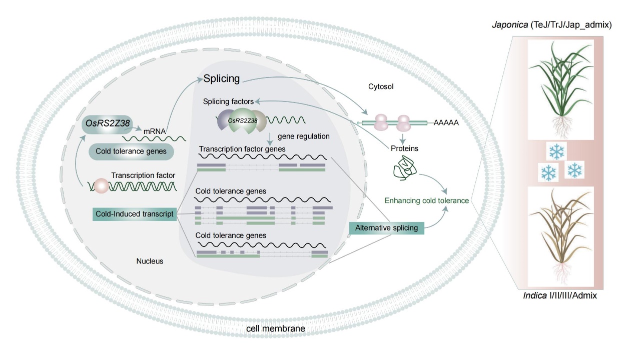 富含丝氨酸-精氨酸(SR)的蛋白质是一类重要的剪接因子,在多种非生物胁迫下促进可变剪接,从而影响植物对这些胁迫的响应。通过对165种水稻材料的重测序数据分析及耐寒性表型评估,发现剪接因子OsRS33和OsRS2Z38对于水稻耐寒具有重要作用。OsRS2Z38基因的功能缺失显著降低水稻幼苗的耐寒性。此外,OsRS2Z38基因在籼稻和粳稻间具有不同的单倍型,粳稻中的OsRS2Z38等位基因型在粳稻的冷适应中可能扮演了重要角色,即剪接因子OsRS2Z38的驯化选择参与亚洲栽培稻的适应性演化。