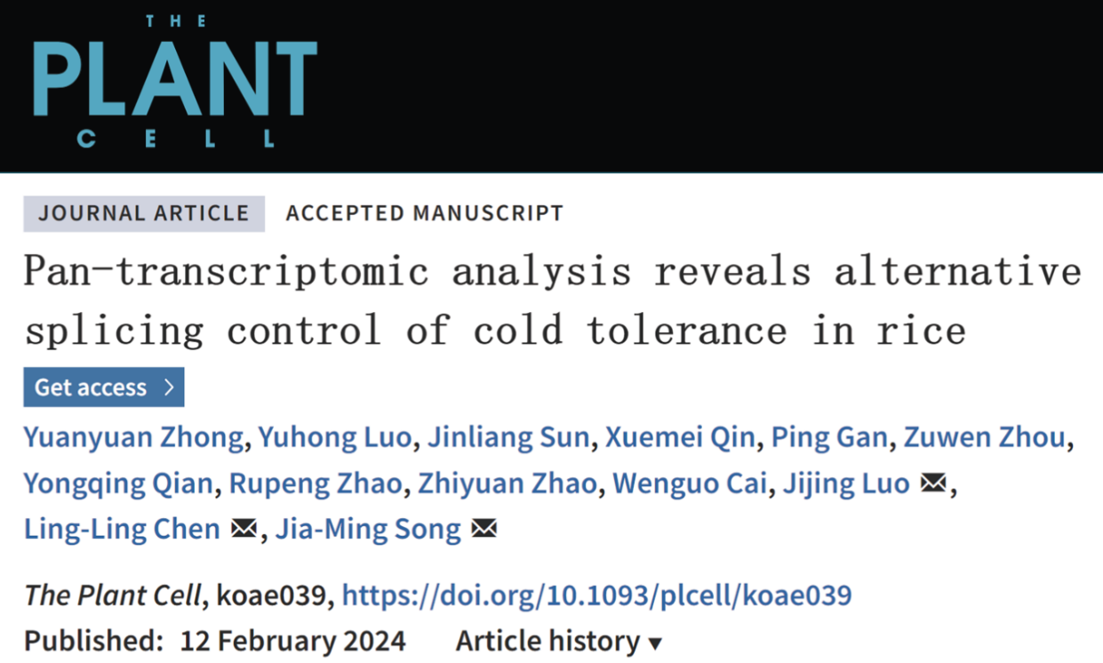 2024年2月12日,西南大学农学与生物科技学院宋佳明研究员和广西大学陈玲玲、罗继景教授团队在国际著名植物学术期刊The Plant Cell在线发表了题为Pan-transcriptomic analysis reveals alternative splicing control of cold tolerance in rice的研究论文,以水稻为模式,构建了泛转录组表征作物响应冷胁迫的转录调控景观,揭示剪切因子的驯化选择参与作物的生态适应性演化。