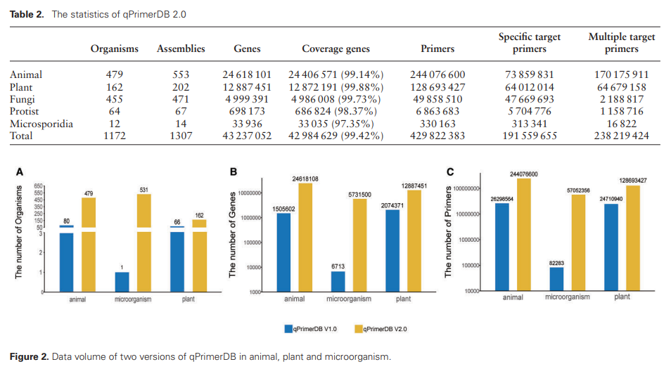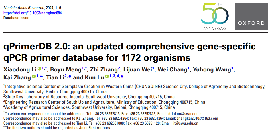 近日,学院油菜分子育种团队在国际知名期刊Nucleic Acids Research上在线发表题为qPrimerDB 2.0: an updated comprehensive gene-specific qPCR primer database for 1172 organisms的研究论文,推出qPCR特异性引物数据库的2.0版本(qPrimerDB 2.0, //qprimerdb.biodb.org/)。该数据库对2018年qPrimerDB数据库进行了重大更新,最新版本不仅涵盖了1172种生物的基因特异性引物资源,还引入了多项功能改进,显著提升了基因表达研究的效率和精度。