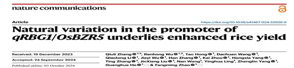西南大学赵芳明教授为该研究的通讯作者,何光华教授为共同通讯作者,张秋丽博士为第一作者,吴仁鸿讲师为共同第一作者。本研究由国家自然科学基金、国家地区联合基金及科技创新重大项目等资助。参考文献或相关阅读:Zhang Q, Wu R, Hong T, Wang D, Li Q, Wu J, Zhang H, Zhou K, Yang H, Zhang T, Liu J, Wang N, Ling Y, Yang Z, He G, Zhao F. Natural variation in the promoter of qRBG1/OsBZR5 underlies enhanced rice yield. Nat Commun, 15,8565 (2024). //doi.org/10.1038/s41467-024-52928-9