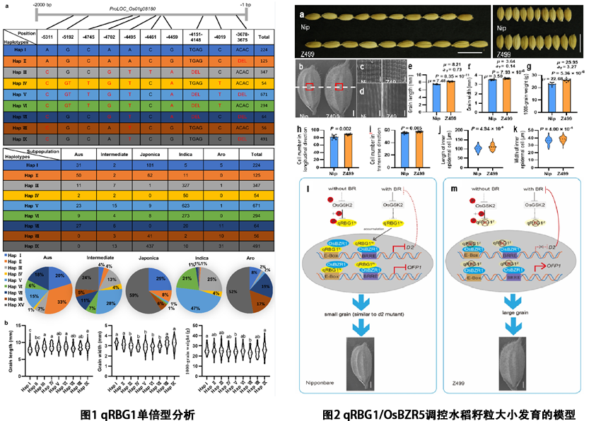 近期,西南大学农学与生物科技学院水稻团队利用粳型亲籼SSSL-Z499图位克隆1个籼、粳亚种间粒型分化的关键基因qRBG1/OsBZR5。 在日本晴背景中含有来自籼型恢复系西恢18的稀有等位变异基因qRBG1Z的单片段代换系Z499 表现长、宽大粒;与日本晴相同的Hap I粳稻品种呈现典型的短、宽粒;与qRBG1Z序列接近的Hap V、Hap VI 和Hap Ⅳ等籼型品种呈现典型的细长粒(图1)。qRBG1为非典型的BES1/BZR1家族新成员OsBZR5,不同于水稻中已报道的OsBZR1-OsBZR4。 qRBG1缺少3个重要的保守结构域, 负调控水稻籽粒大小,而OsBZR1–OsBZR4 正调控水稻籽粒大小。通过一系列实验表明,qRBG1/OsBZR5 和 OsBZR1协同抑制 BR合成途径基因D2, 而拮抗介导BR信号途径调控籽粒大小的基因OFP1。该研究阐明了通过OsGSK2–qRBG1–OsBZR1–D2–OFP1调控水稻籽粒大小的新分子机制 (图2),为提高水稻产量提供了新途径。该研究结果在线发表在Nature Communications, 2024,15:8565. 题目“Natural variation in the promoter of qRBG1/OsBZR5 underlies enhanced rice yield”。
