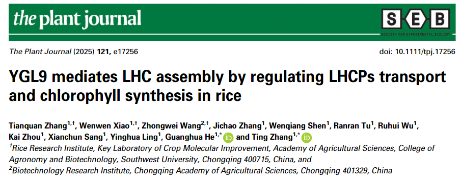 近日,西南大学农学与生物科技学院水稻团队在 The Plant Journal上发表了题为《YGL9 mediates LHC assembly by regulating LHCPs transport and chlorophyll synthesis in rice》的研究论文,解析水稻LHC组装的分子机制。