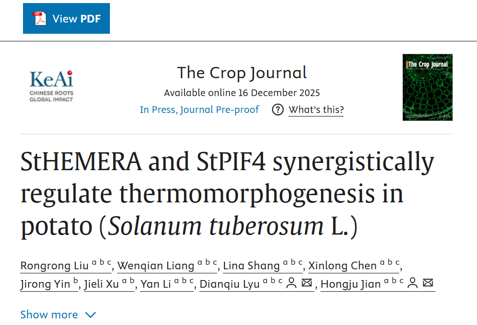 薯类研究团队在The Crop Journal在线发表了题为“StHEMERA and StPIF4 synergistically regulate thermomorphogenesis in potato (Solanum tuberosum L.)”的研究论文,该研究首次鉴定出马铃薯中热响应型核-质体穿梭转录激活因子 StHEMERA(StHMR),揭示了 StHMR 与 StPIF4 形成调控模块协同调控马铃薯热形态建成的分子机制,为培育耐高温马铃薯品种提供了重要的分子靶点。