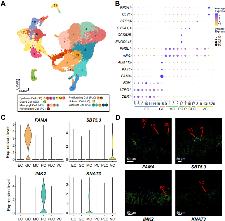 马铃薯是具有重要营养和经济价值的全球性粮食作物。热胁迫显著抑制马铃薯植株生长与块茎发育,制约着马铃薯产业的可持续发展。本研究通过单细胞转录组测序技术描绘了首个马铃薯叶片在热胁迫下的单细胞转录图谱,鉴定了21个细胞簇和6种主要细胞类型,并在异质性细胞群中发现了马铃薯的全新细胞类型特异性标记基因。通过单细胞拟时分析发现表皮细胞是热应激响应的关键细胞类型,其差异表达基因数量最多;而维管细胞位于伪时间轨迹的过渡区,可能参与细胞分化过程。通过整合批量RNA测序数据,构建了热应激响应共表达网络,鉴定出12个核心转录因子,并进一步通过实验验证热胁迫显著诱导StPIF4表达。功能研究表明,StPIF4通过增强活性氧清除能力显著提高马铃薯耐热性。本研究从细胞层面揭示了马铃薯适应热胁迫的机制。