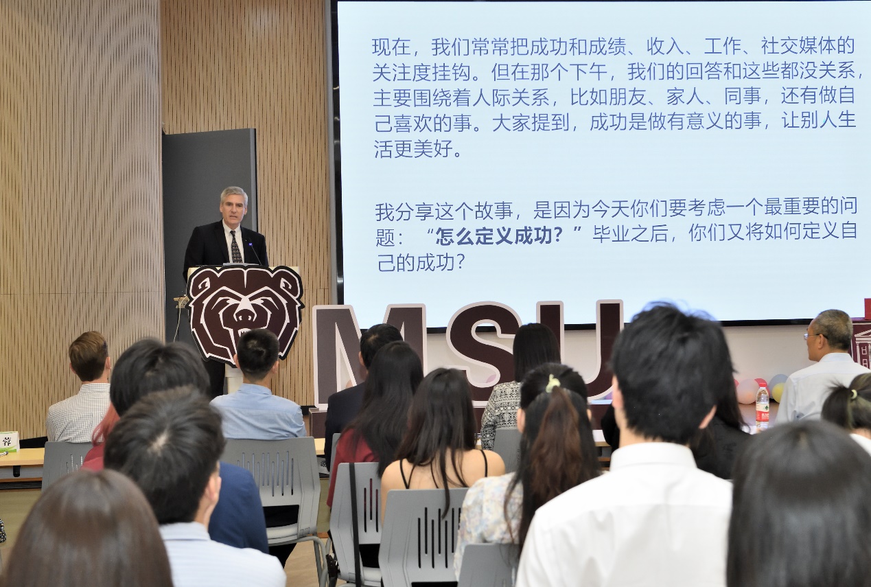 MSU布莱德副校长祝贺同学们顺利完成学业并即将开启人生新篇章。他提到成功不仅关乎个人成就,更在于对他人生活的积极影响,并鼓励同学们思考如何定义自己的成功。同时,他肯定了西南大学与密苏里州立大学合作办学项目的意义,感谢双方师生的付出与努力。