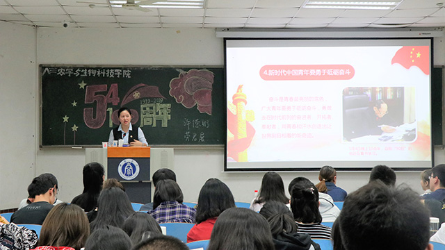 为深入学习习近平总书记在纪念五四运动100周年大会上的重要讲话精神,激励和引领广大青年团员继承和发扬五四精神,5月5日下午五点半,农学与生物科技学院在32教212举行了以“弘扬五四精神,争做时代新人”为主题的团课学习,本次团课由学院团委书记许莹竹老师主讲。