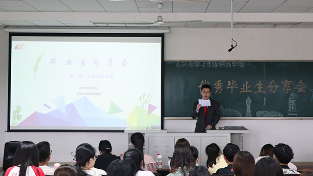 为帮助同学们更好地了解考研保研的相关事宜,熟悉近年来的考研形势,尽快确定自己的目标方向,5月12日下午3点,农学与生物科技学院在35教519举办了2019届毕业生考研保研经验分享会。