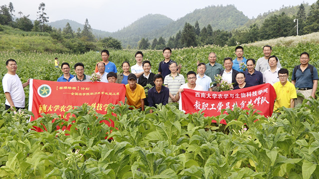 为深入学习贯彻习近平新时代中国特色社会主义思想和党的十九大精神,深入发力国家脱贫攻坚工程,汇智聚力国家乡村振兴战略,7月13—14日,农学与生物科技学院“科技扶贫”师生服务团在院党委书记赵子华、院长何光华带领下,赴国家扶贫工作重点县--重庆市彭水苗族土家族自治县开展农业科技下乡活动,将先进农业科技运用到实际生产,助力彭水的农业生产和农民致富。实践团由院长何光华领衔,由专家教授13人和学生6名组成,其中含博士生导师5人,研究领域覆盖水稻、油菜、棉花、烟草、小麦、玉米、薯类等多种作物,学生包括博士研究生1名和本科生5名。通过召开农业科技座谈会,与彭水县农业技术推广中心、彭水县烟草公司相关领导就基层农业发展问题进行探讨和交流,并实地考察烟草种植基地,就基地实际生产情况提供技术指导。