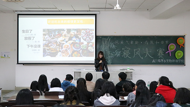为营造良好的学生和生活环境,建设积极健康向上的寝室文化,以优良寝风促进学风,农学与生物科技学院于3月25日下午两点在35教418教师进行了首届寝室风采大赛决赛。学院团委学生会主席团以及各部长担任本次比赛评委。经过为期5天的初赛角逐,评审团分别从卫生、纪律、学习三方面对各寝室进行打分并排名,最终有10个寝室入围决赛。