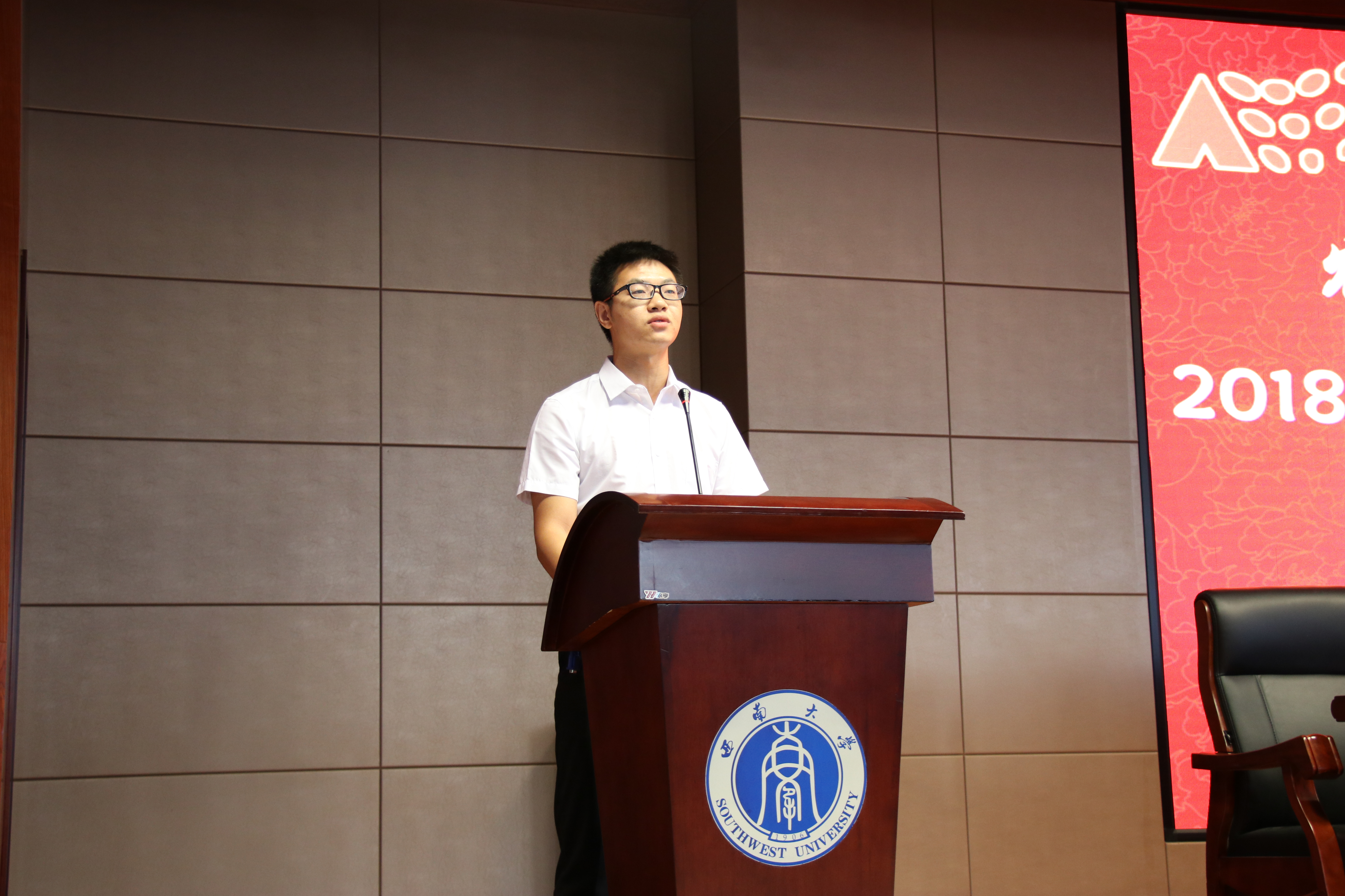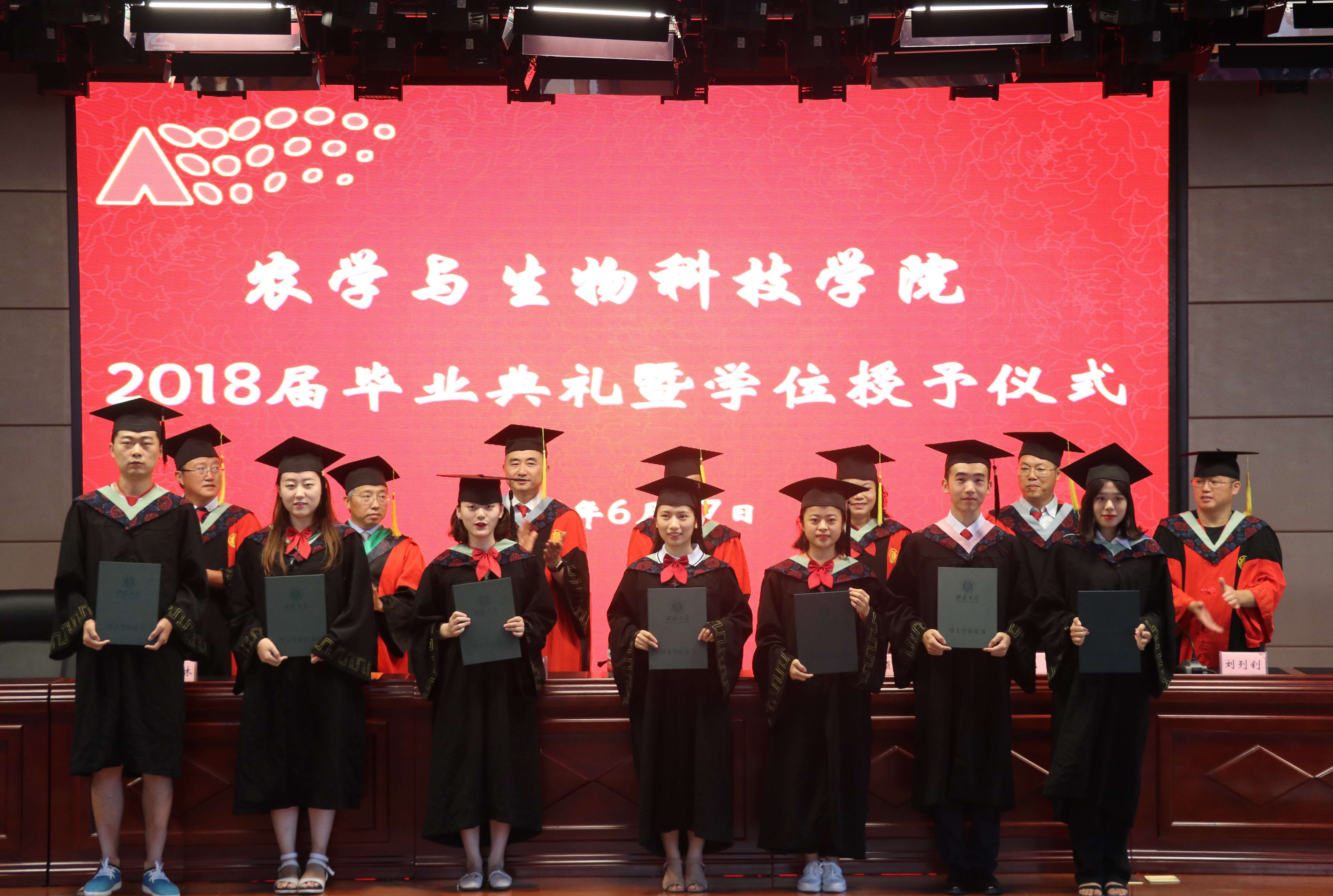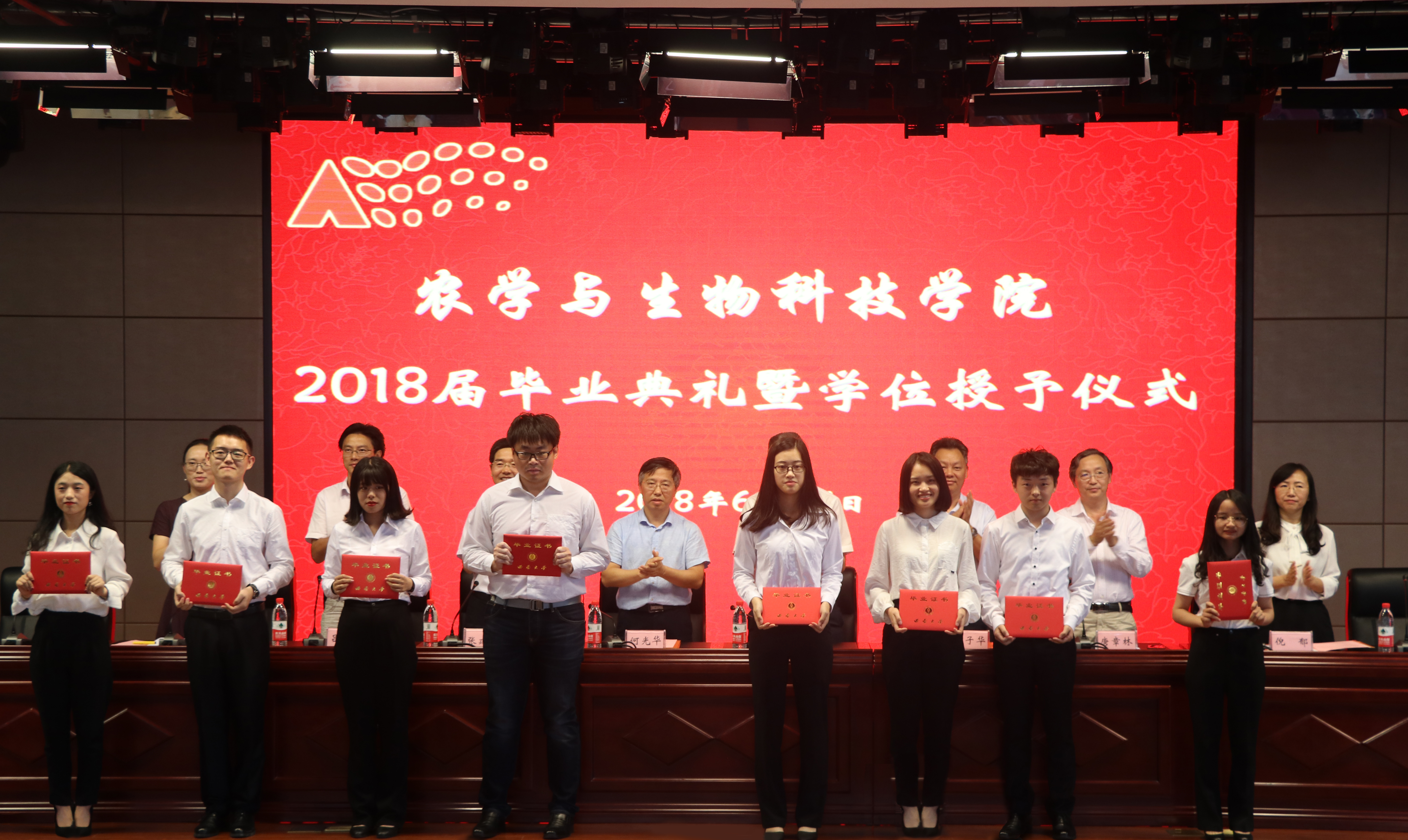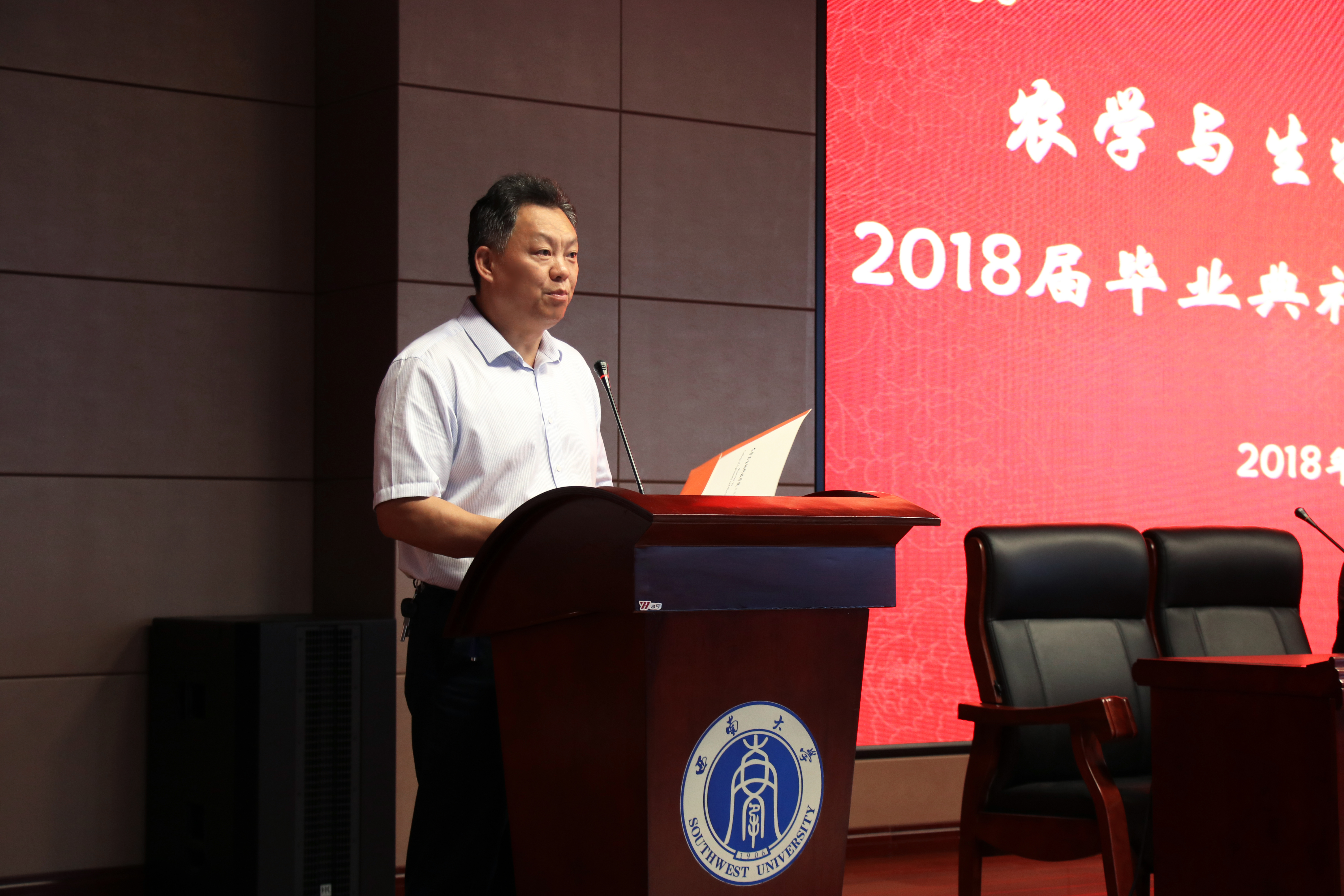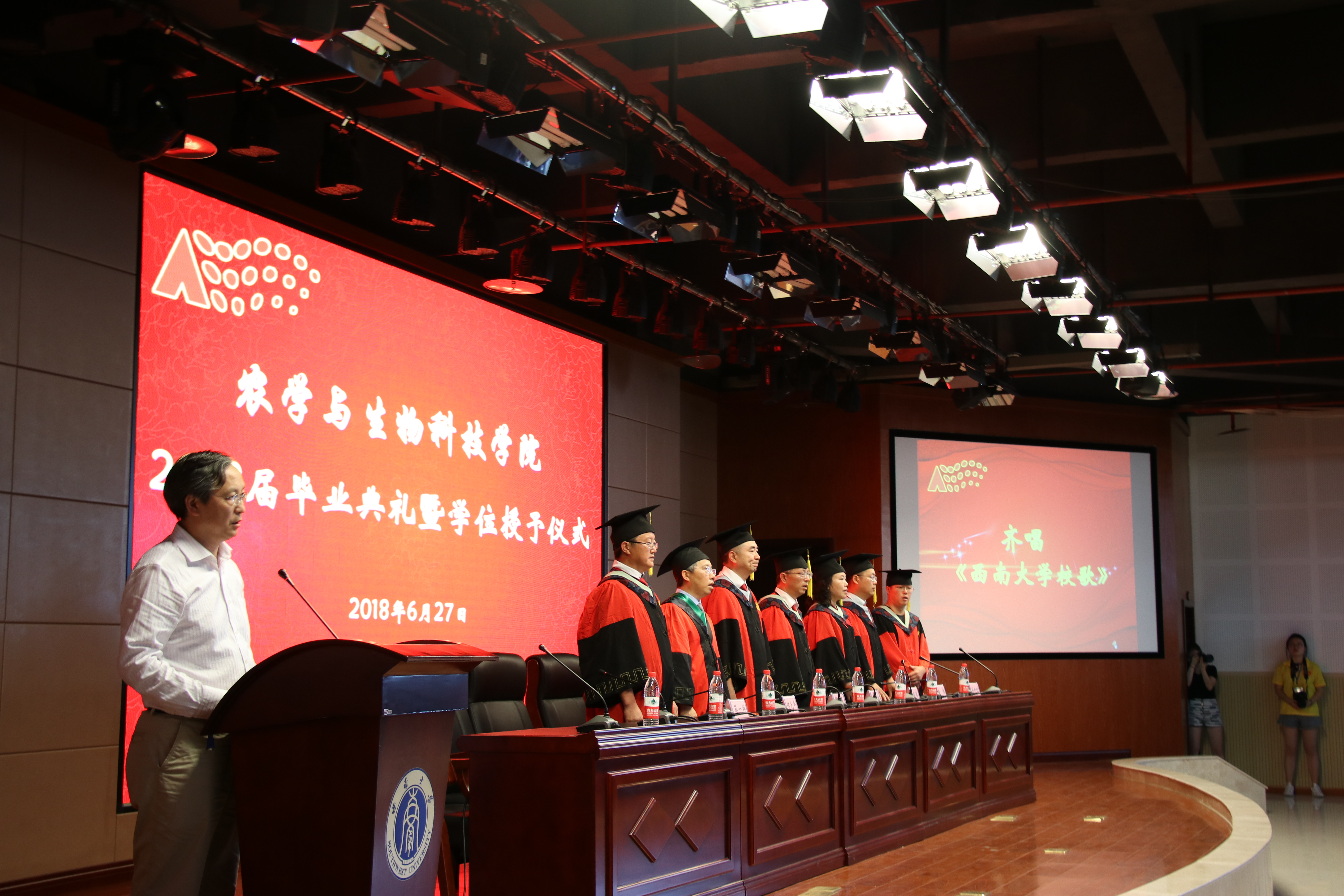 6月27日下午,西南大学农学与生物科技学院2018届研究生及本科生毕业典礼暨授位仪式在隆平楼四楼报告厅隆重举行。出席此次仪式的有西南大学副校长周常勇、农生院党委书记赵子华、院长何光华、党委副书记方凤玲、副院长唐章林、副院长张建奎、学院学术委员会成员、各系主任、实验室主任、硕士生导师、毕业班班主任、辅导员、教学秘书、全体毕业生,16级在校生代表观礼。