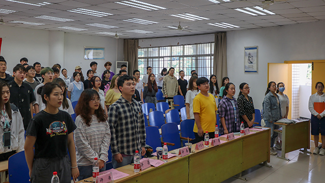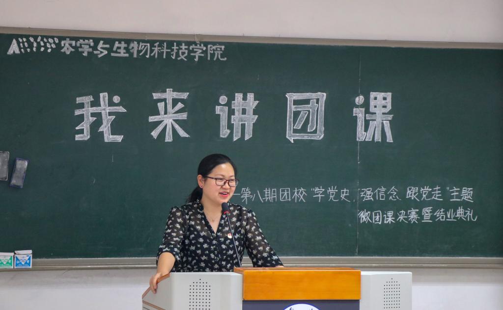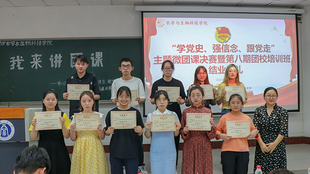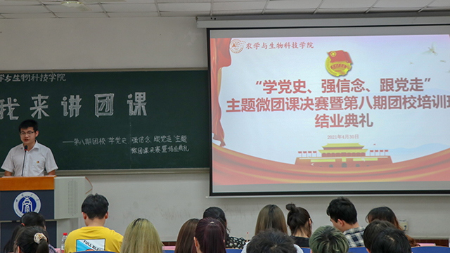为庆祝中国共产党成立100周年,加强党史学习教育,农学与生物科技学院团委于2021年4月30日下午2:00在32教学楼514教室举办以“学党史,强信念,跟党走”为主题的 “我来讲团课”主题微团课比赛第八期团校暨结业典礼。团委书记兼2019级辅导员许莹竹老师、本科生四个党支部学生党员代表邓超、谢冰一、江青莲、张帅以及学生会执行主席李欣玥、学生会副主席王雪松出席并担任评委,本期团校全体学员到场观摩学习。