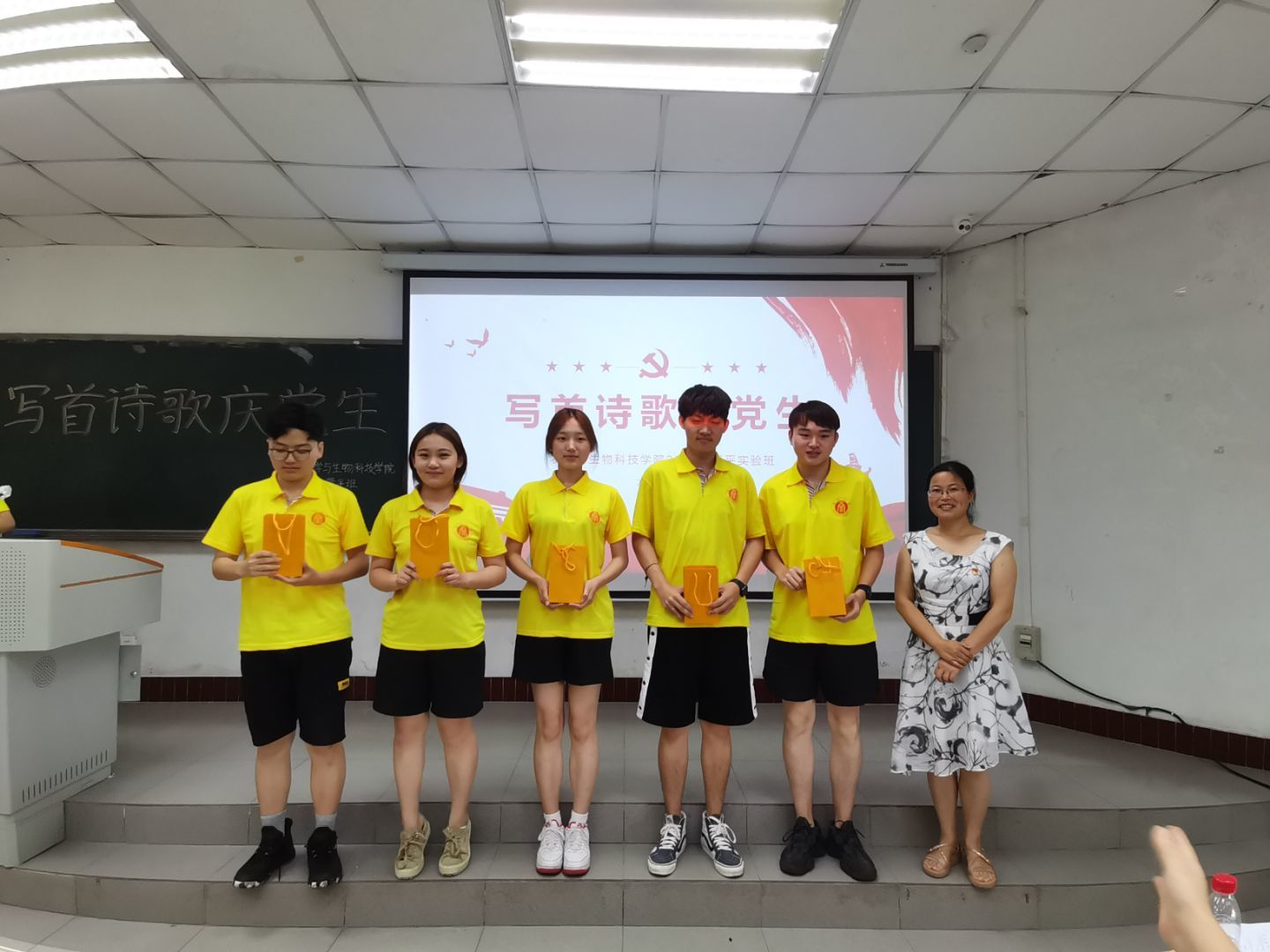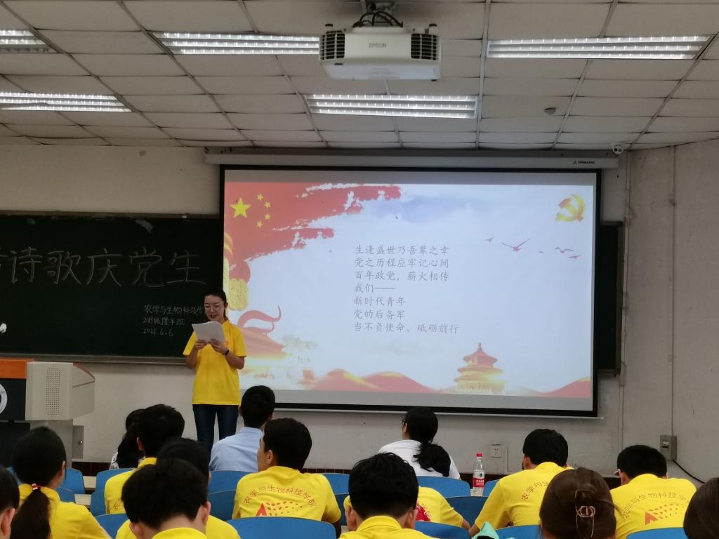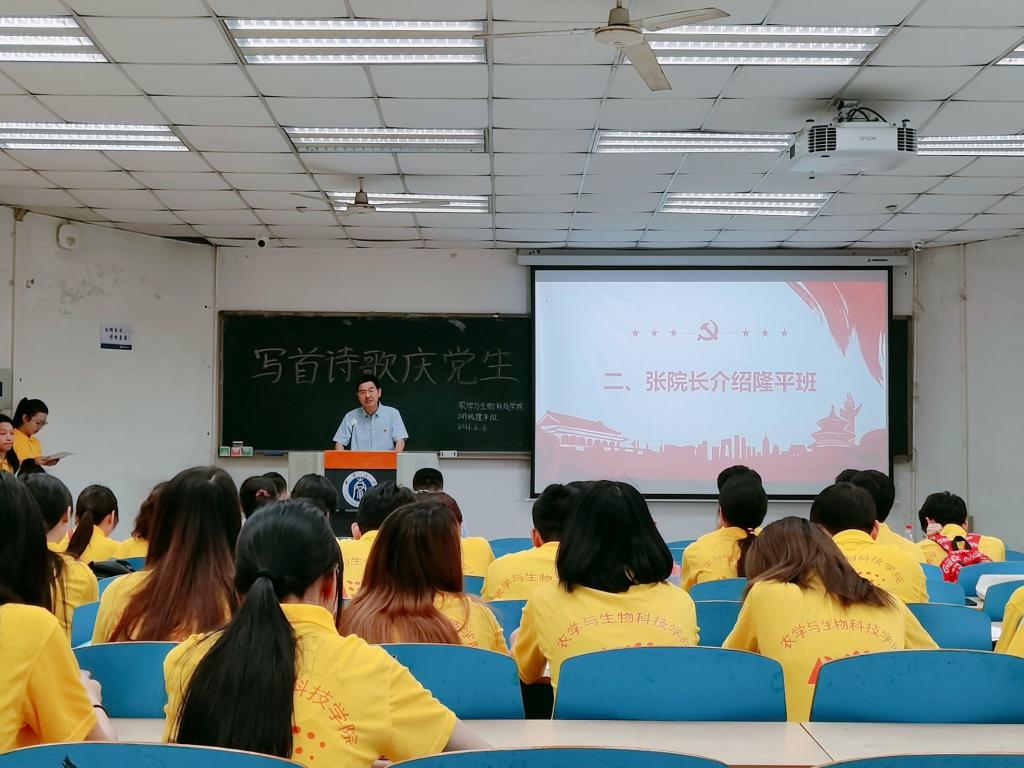为庆祝中国共产党成立一百周年,展现农学与生物科技学院学生良好风貌,推进党史学习教育走深走实,农学与生物科技学院2019级隆平实验拓展班团支部于2019年6月6日上午9点在32教213教室开展了“写首诗歌庆党生”主题原创诗歌朗诵团日活动活动,以青年视角献礼建党百年。农学与生物科技学院党委副书记郑莉佳老师、副院长张建奎老师、团委书记兼2019级辅导员许莹竹老师、教务办公室卢会翔老师、隆平拓展班班主任姚贺盛老师出席活动并担任嘉宾评委。