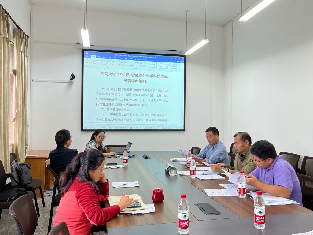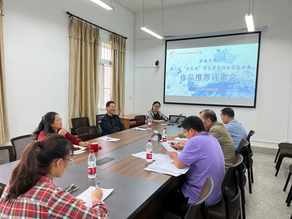 2022年10月25日上午9点,农学与生物科技学院于棉研楼406会议室召开了西南大学第八届“含弘杯”学生课外学术科技作品竞赛作品推荐评审会暨学院第十五届本科生学术论文大赛作品评审会。学院党委副书记郑莉佳、副院长张建奎、团委书记许莹竹出席会议,邀请到学院王龙昌教授、曲存民教授、桑贤春副教授担任评审专家,共同评审推荐本年度参赛作品。会议由学院团委书记许莹竹主持。