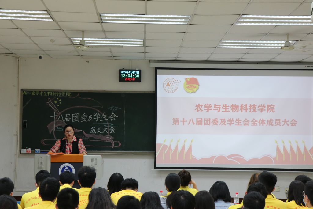 会议第一项,西南大学校学生会校主席团成员邓泽奕同学发言,他号召所有学生骨干应践行“全新全意服务同学”的宗旨,积极开展各项工作,同时通过强化政治引领,践行服务宗旨,勇于自我革命,切实塑造起新时代学生会清新阳光的形象。他强调,正值全校上下深入学习贯彻党的二十大精神之际,作为学生骨干,也应发挥好桥梁作用,不断团结带领广大学子坚定不移做时代好青年。“参与多深,领悟多深,投入多少,收获多少”,邓泽奕同学以自己的座右铭,来激励广大农生学子要积极发挥模范作用,在自己的工作岗位上认真履职尽责。