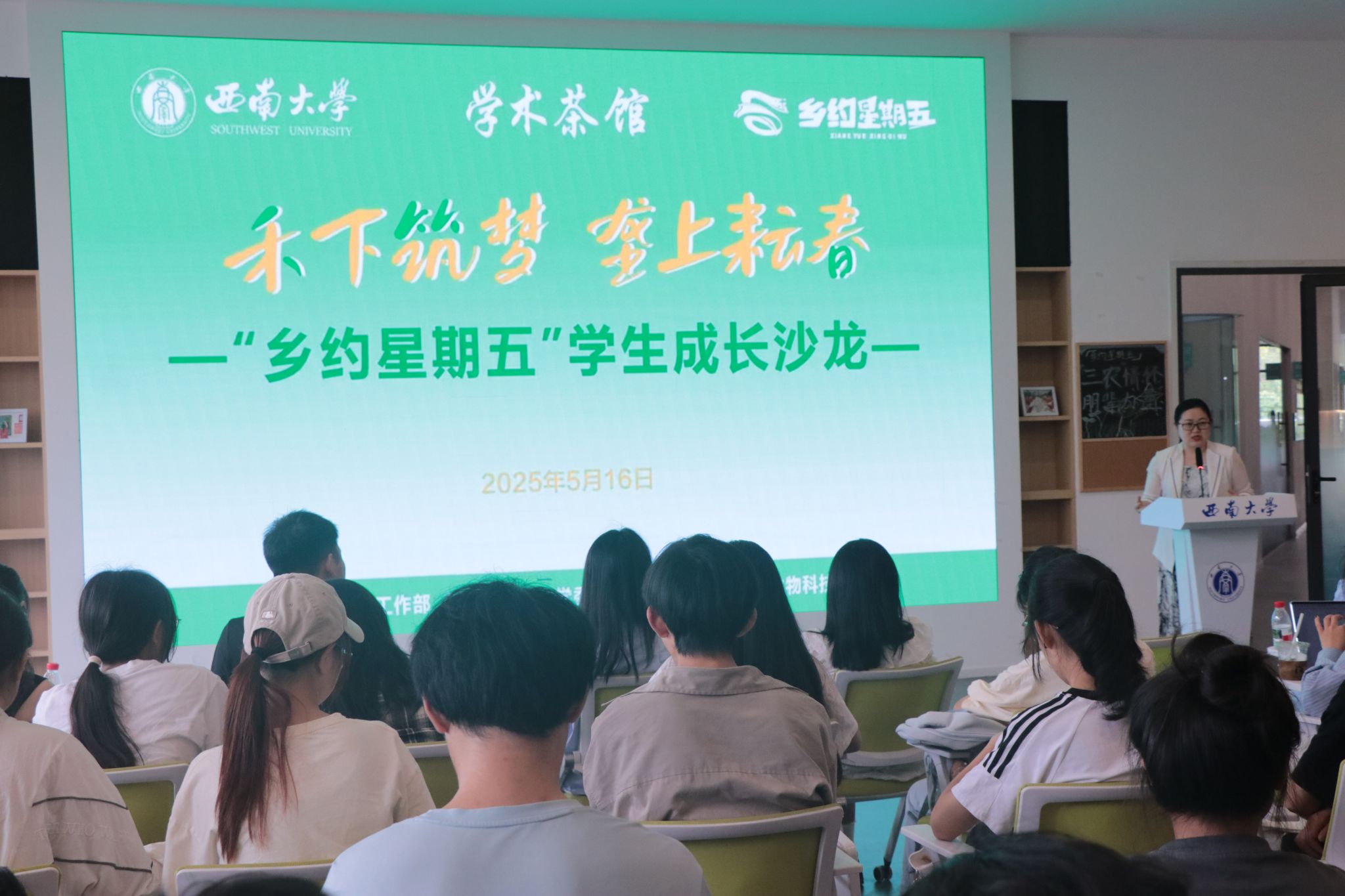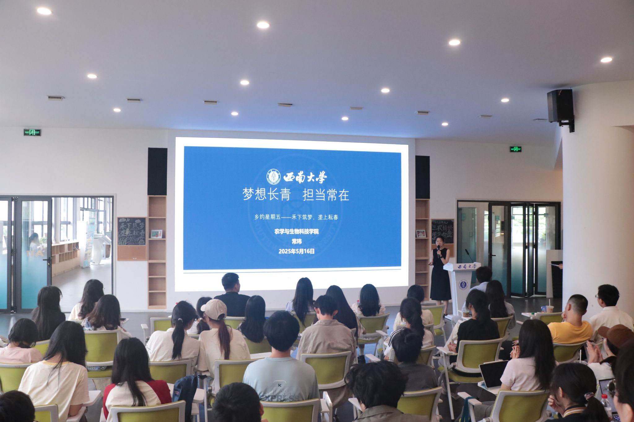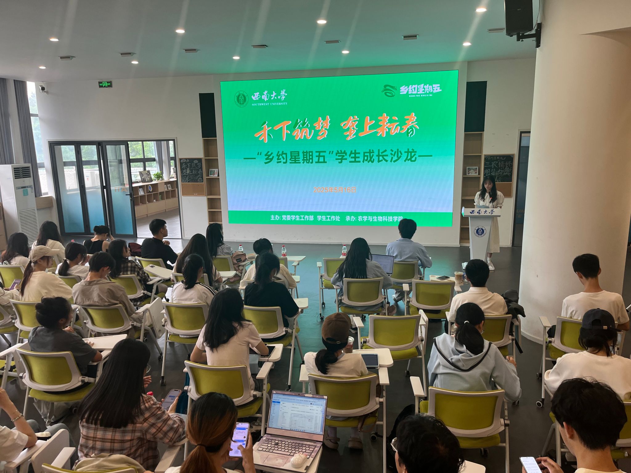 5月16日下午,由西南大学党委学生工作部、学生工作处主办,农学与生物科技学院承办的第八期“乡约星期五”学生成长沙龙在青李空间多功能厅成功举办。本期沙龙以“禾下筑梦,垄上耘春”为主题,通过邀请学院4名优秀学生代表,围绕青年农学人的成长与实践展开分享,为农科学子带来了一场思想与经验的盛宴。学院团委书记许莹竹老师、部分涉农专业学生参与活动,本次沙龙由学院2023级学生聂雪莹主持。