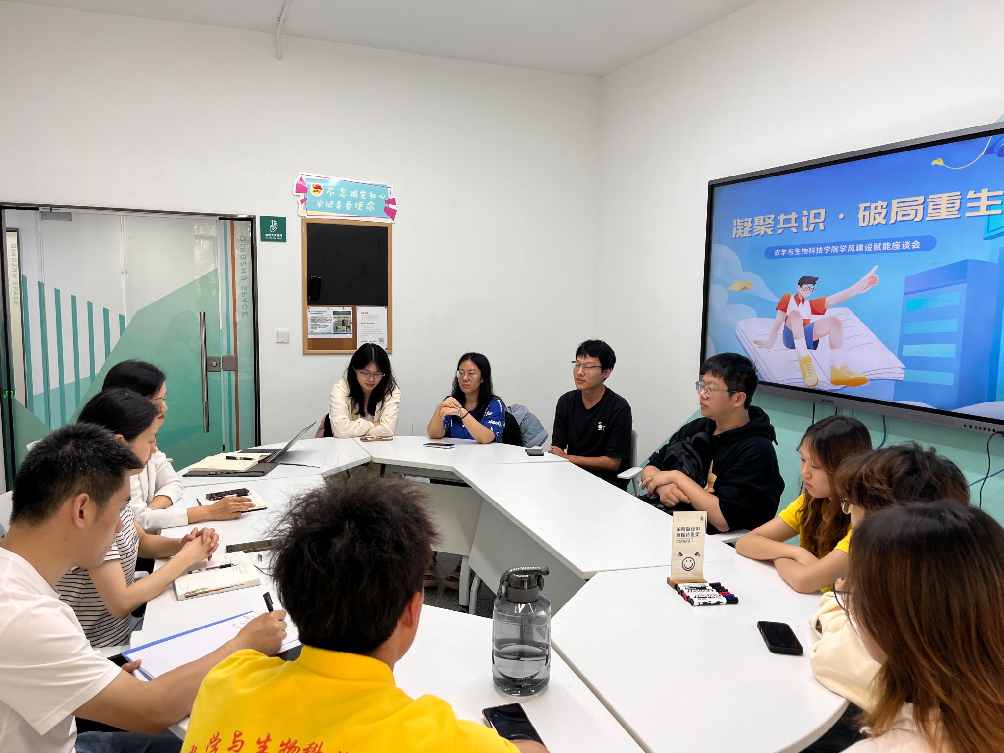 为积极响应学校学风建设年的号召,深入落实育人力量下沉学生社区的工作要求,进一步优化学院学风建设,提升人才培养质量,4月28日,农学与生物科技学院本科2024级在青竹空间举办了学风建设赋能座谈会。学院党委副书记刘秋艳、2024级植科3班班主任王凡龙、共课老师蒋锐、辅导员王皓以及班级班委和寝室长代表,各方围绕班级学风建设展开深入交流,共同为提升学生学习质量出谋划策。