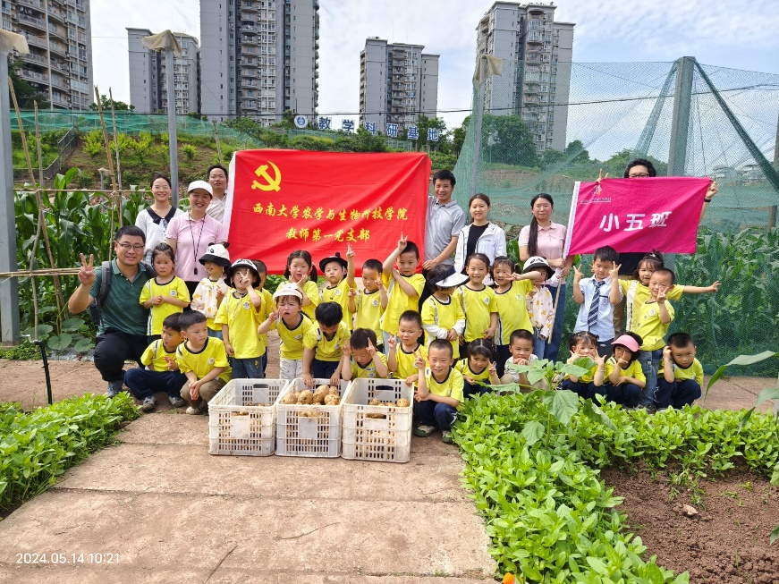艳阳高照,晴空万里,支部书记张婷带领全体支委一行4人,走进西南大学农学基础实验教学中心农场,为西南大学附属实验幼儿园小朋友实地介绍了学院薯类作物研究所的最新科研成果“缙云薯11号”。该品种创重庆早熟鲜食马铃薯产量历史新高,兼具高产、早熟、耐阴、抗病等特性,是重庆首个自主选育的早熟鲜食马铃薯新品种。