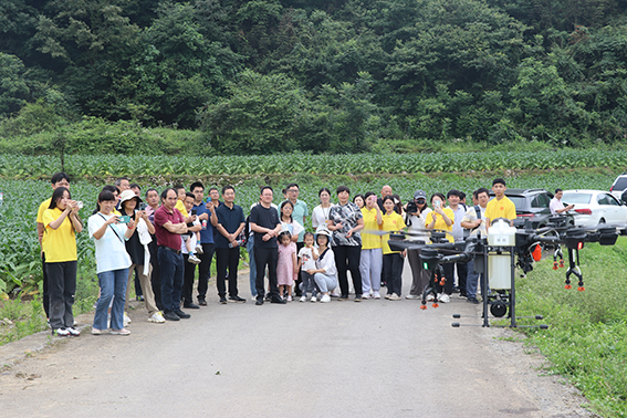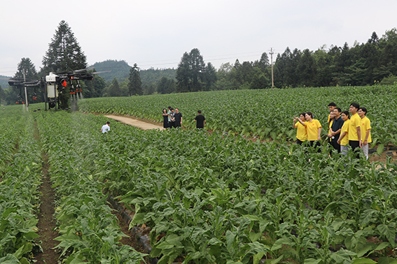 实践团师生还前往烟田开展无人机喷洒叶面肥技术服务,用科技赋能烟草产业。无人机进行智能作业,可以自主规划选择航线,在各种复杂的地理条件下,仍然能畅通无阻。“无人机雾化喷施可以保障肥料在叶片上均匀分布,能满足叶片对不同元素的需求,省时省力又节约高效”,农学与生物科技学院副院长张建奎老师向烟农和实践团的学生进行讲解。实践团成员纷纷走进烟田,观察烟草的生长发育状况,把课堂学习和乡村实践结合起来,真正做到知行合一。“他在打顶抹杈,是保障烟叶质量的重要技术,这是我们上课学过的内容,今天亲眼看到了”,实践团成员高旗阳同学望向田间的烟农兴奋地说道。
