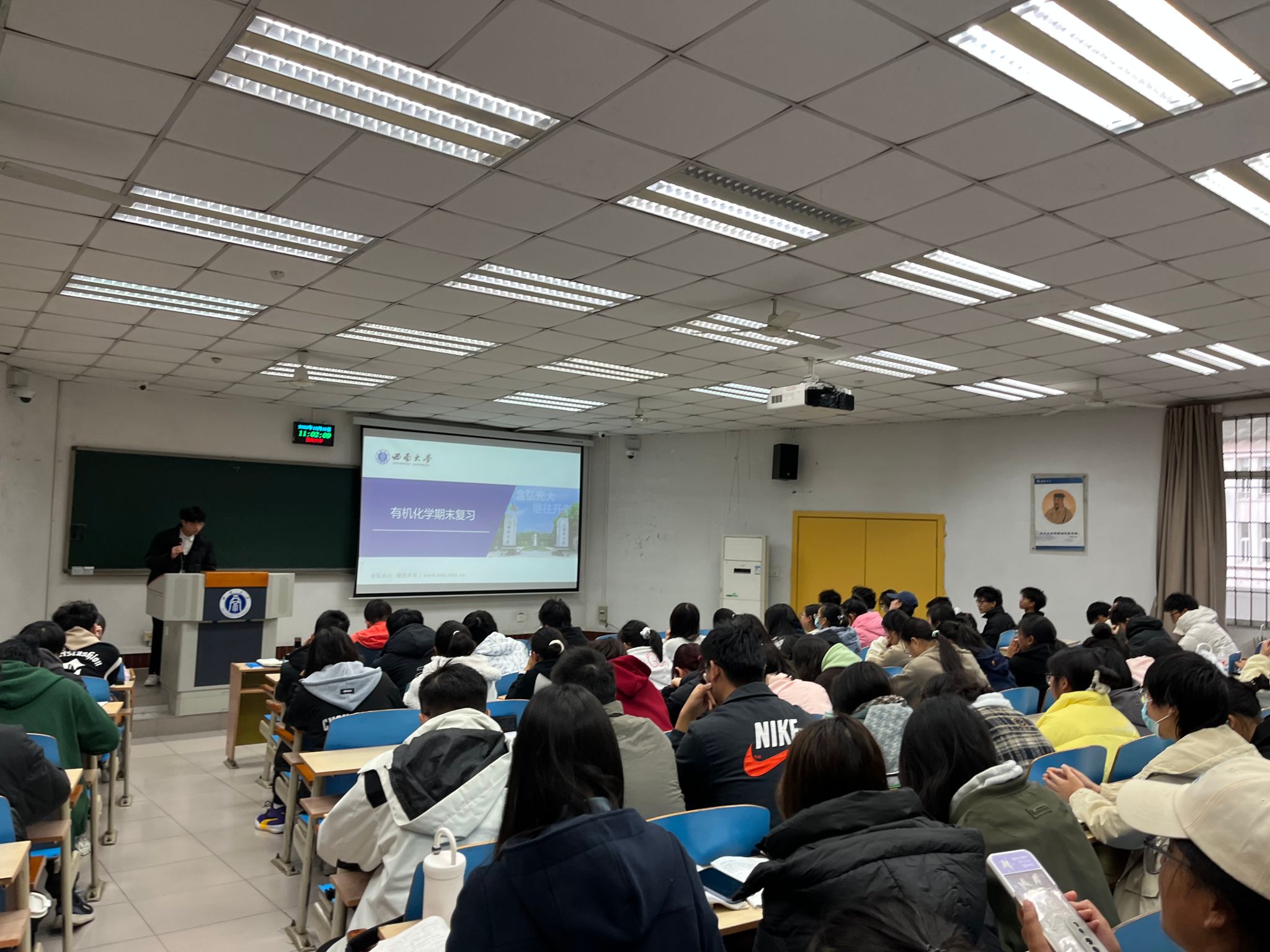 其次,2021级汤杰臻、2021级郑凯琴、2022级郑馨媛、2022级邱杰四名优秀学长学姐分别上台向同学们分享学习经验和方法。汤杰臻同学以自身未学过化学但仍能攻克难关的亲身经历现身说法,为同学们建立自信。他指出,同学们需要保持一个积极的学习心态,相信自己能够在掌握好所学的新内容的同时巩固已学过的内容。他鼓励同学们多去图书馆,自习室等地方,确保学习环境的安静和舒适,有助于提高注意力,将其他无关因素远离学习区域避免受到干扰。郑凯琴同学首先强调了自信的力量,同时提出对自身学习能力和智力的自信,可以减少我们的内耗,从而培养积极的心态。我们不应对课程学习有抵触,而是从中找到兴趣点,以此为我们提供情绪价值,增强我们学习的动力。例如,做对了一道题,听懂了一个知识点,从不落下一节课,得到老师的肯定,都能让我们从中获得成就感,增强学习自信。其次,她鼓励大家找到适合自己的学习方法,而不是一味的照搬其他优秀同学的学习方法。郑馨媛同学建议大家根据考试时间先后顺序安排复习顺序,利用空余时间准备充分,从网上寻找一些有趣的学习内容进行复习,以调动复习的积极性和做题的高效性。邱杰同学着重为大家梳理了本学期期末的重要考点,如有机化合物的命名,各类有机物的反应和方程式,从而帮助大家的复习更加有针对性;另外他也提供了一种高效的复习方法——“珍珠项链”式复习法,根据不同的体系构建主线,再把知识点穿到主线上形成一串学习“项链”。学长学姐们的分享让大家收获颇丰,同学们纷纷表示要学习先进经验,全身心投入期末复习,攻克下大学第一次考试。