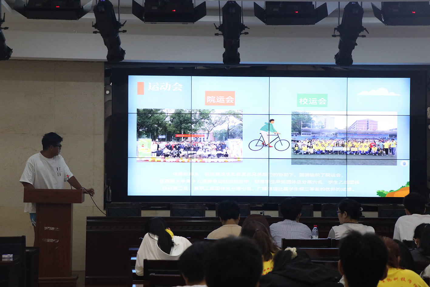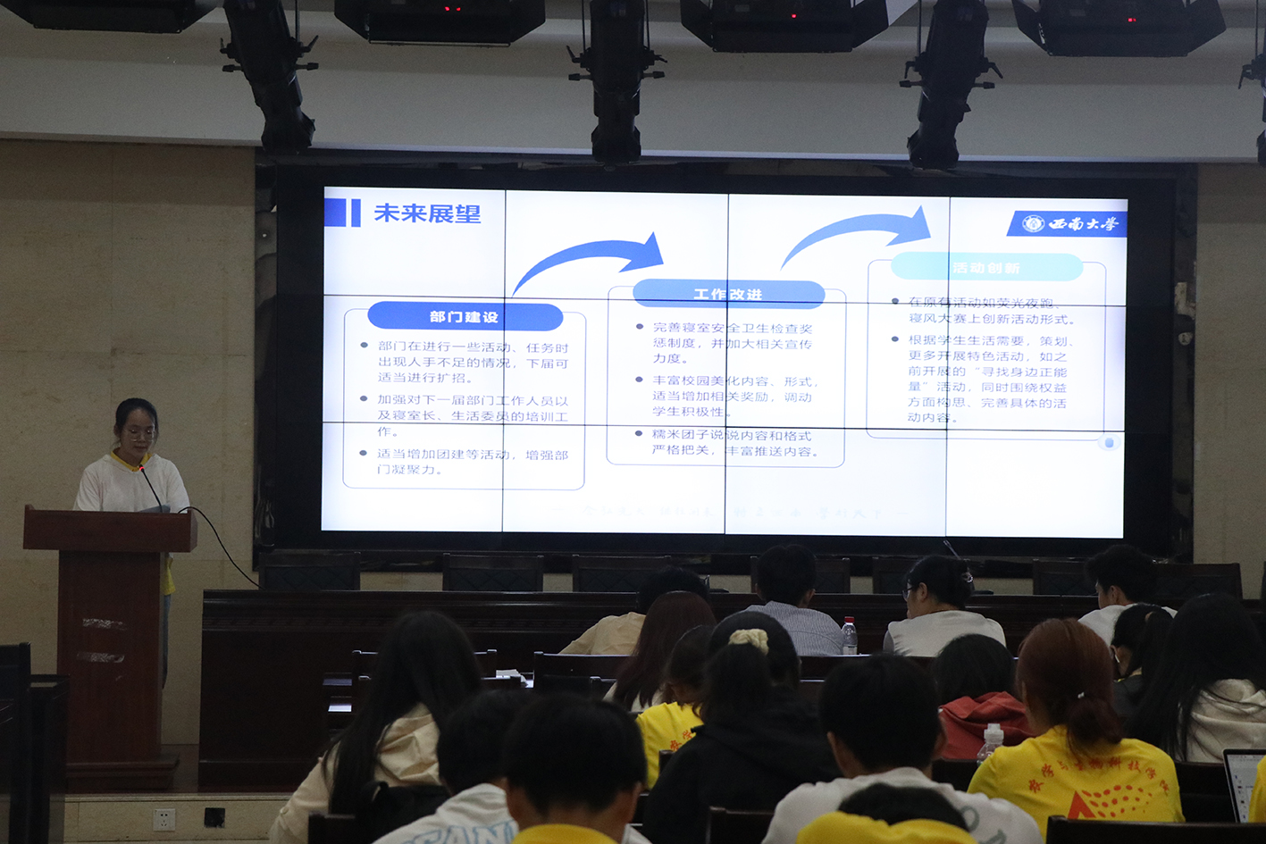 生活权益部负责人王瑞莹同学对部门“荧光夜跑”、“寝室风采大赛”等品牌活动的开展情况进行总结,并分享部门活动分工细致明确、预演备案准备充足等亮点。