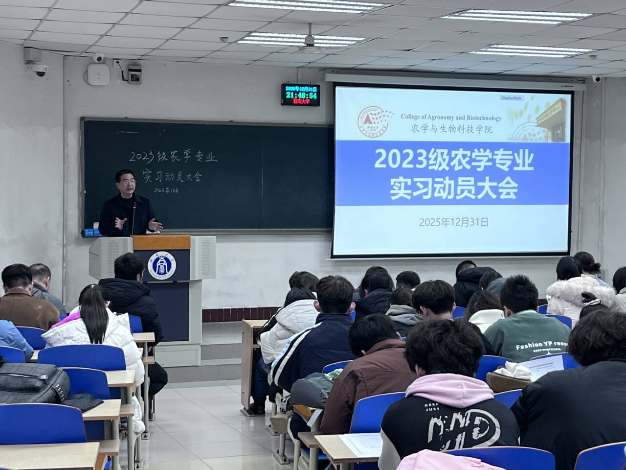 农学专业动员会于2025年12月31日晚举行,由农学系主任桑贤春主持。副院长张建奎、原2023级辅导员植物保护学院党委副书记)许莹竹、农学系副主任郭凯、班主任及带队教师代表、教务办与学工办教师共同参会。会上,郭凯老师详细介绍了专业实习安排及实习成绩考核等内容,辅导员王皓就实习安全事项进行说明,教务办徐鑫老师讲解了实习系统操作流程。张建奎副院长作总结讲话,强调实习是衔接理论与实践的关键环节,鼓励同学们在实践中锻炼能力、积累经验。