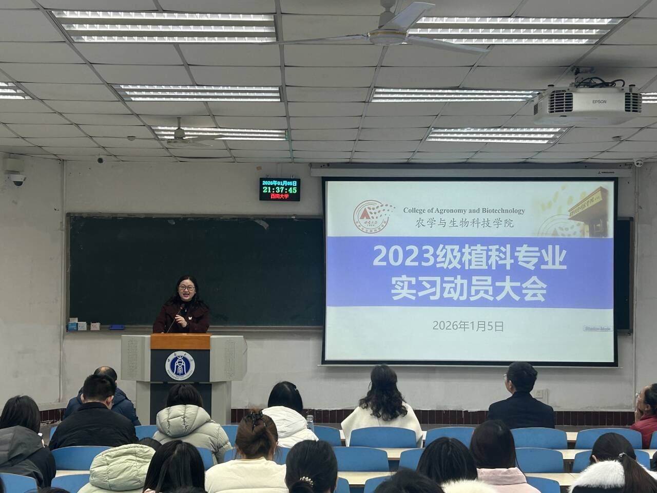 植科专业动员会于2026年1月5日晚召开,由植科系主任杜海主持。学院党委副书记刘秋艳、副院长张建奎、原2023级辅导员植物保护学院党委副书记许莹竹、植科系全体负责人、班主任教务办与学工办教师出席会议。会议议程涵盖实习安排解读、实习成绩考核、安全教育强调、系统操作指导等多方面内容。许莹竹老师作为原辅导员寄语学生,张建奎副院长作动员讲话,刘秋艳副书记进行总结讲话,并对同学们提出纪律与安全方面的明确要求。