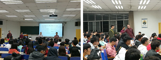 为了提升课堂趣味性,深化合作办学的植科学生对英语文化的了解,增强学习英语的兴趣和积极性,经过与学院领导的协商,Nathaniel将10月31日晚上的小课调整为2019级植科专业全体学生的大课,并邀请MSU助理副校长Brad Bodenhausen、MSU远程教育与留学顾问Craig Workman、MSU国际课程与项目发展官员Peng Zhang、西南大学国际处国际交流科王骏科长,共同参与主题课堂。